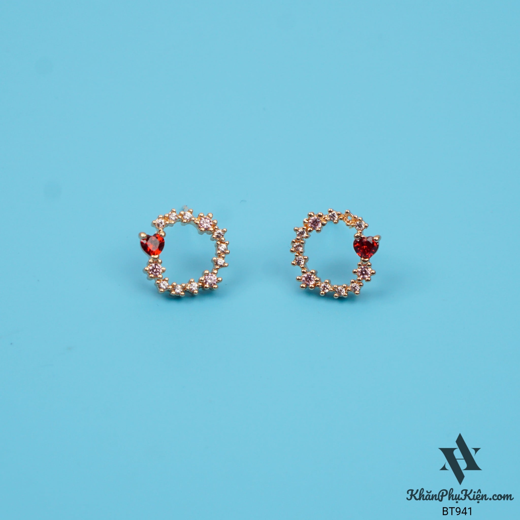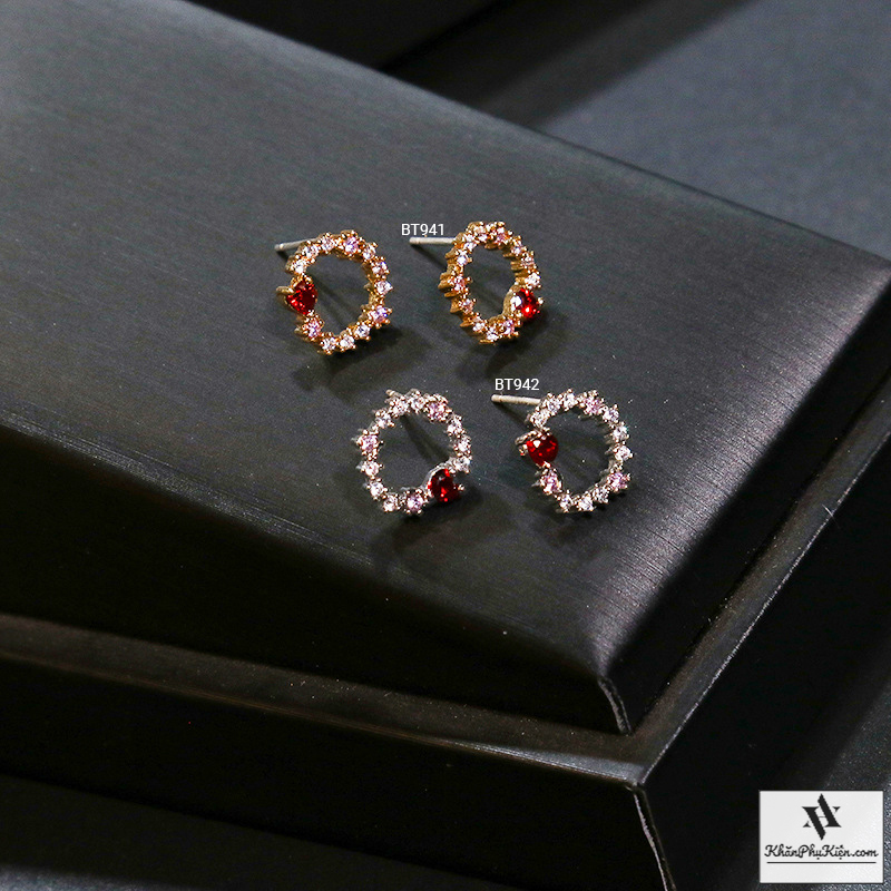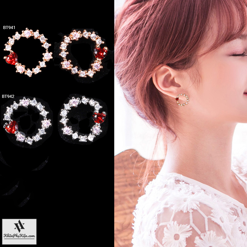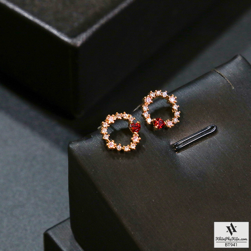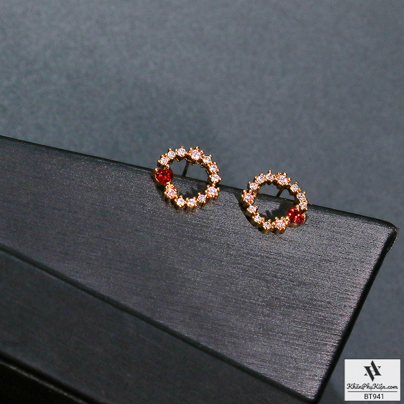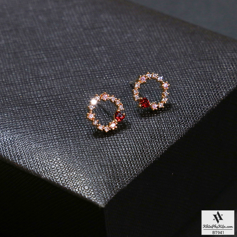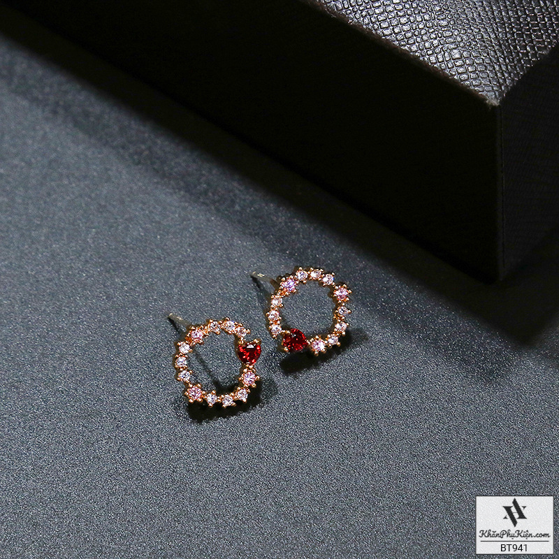 Bông Tai Form Ngắn Hình Tròn Đính Đá Trái Tim Đỏ Mạ Vàng - Mã BT941