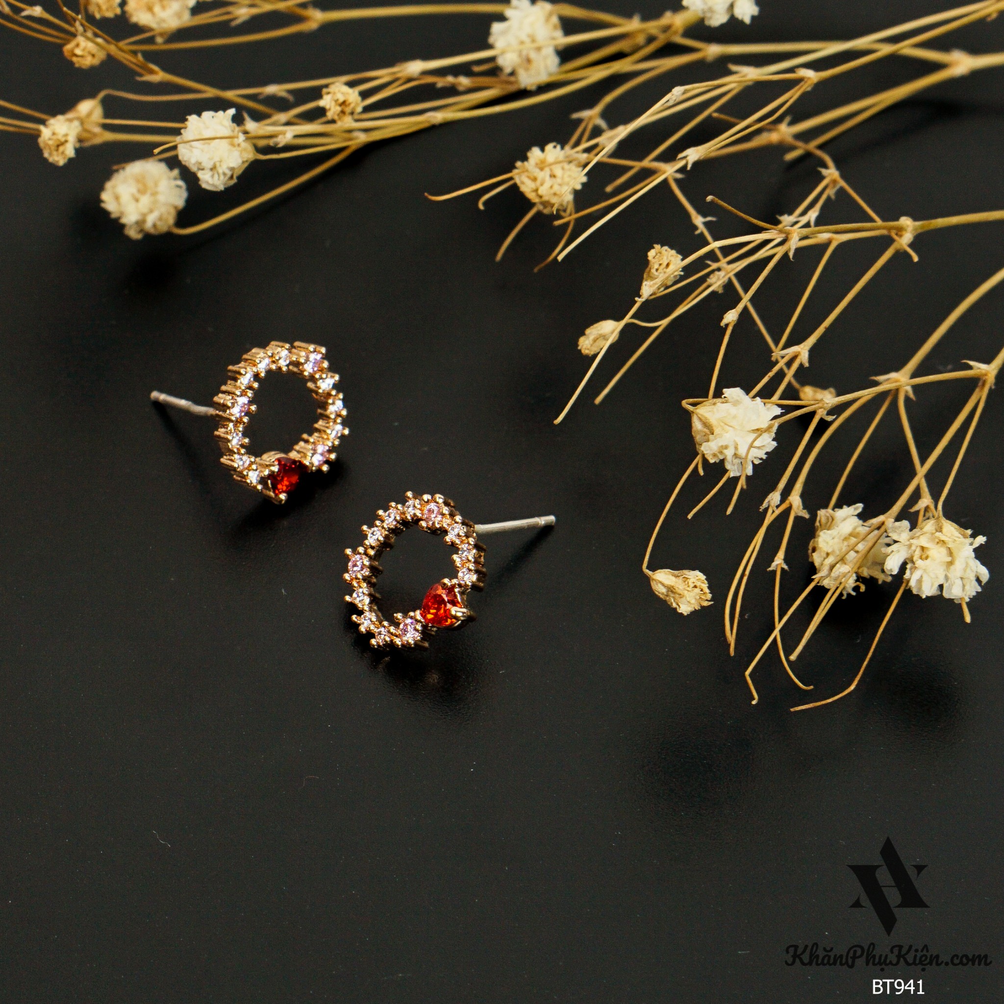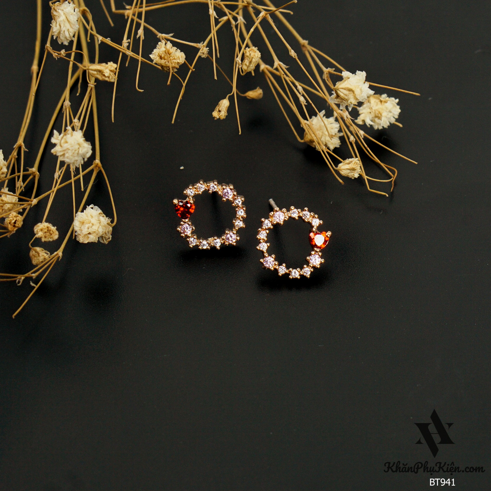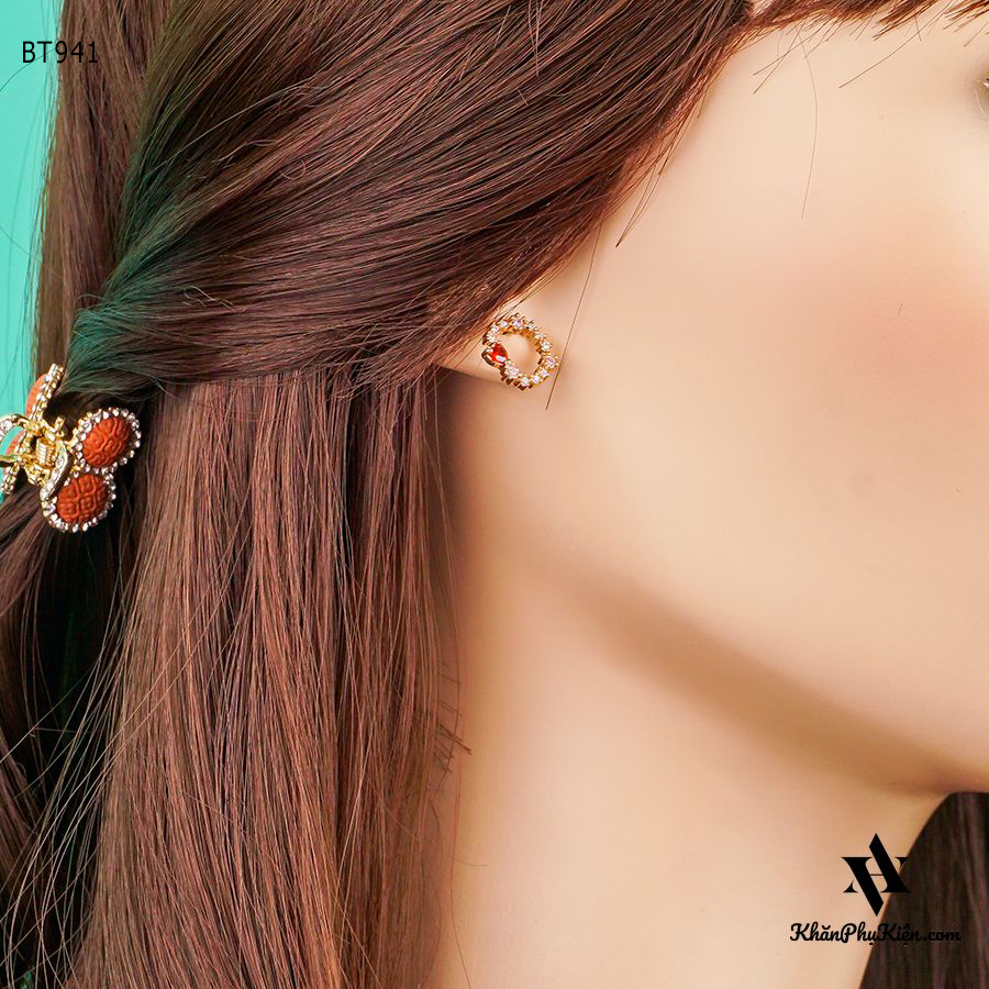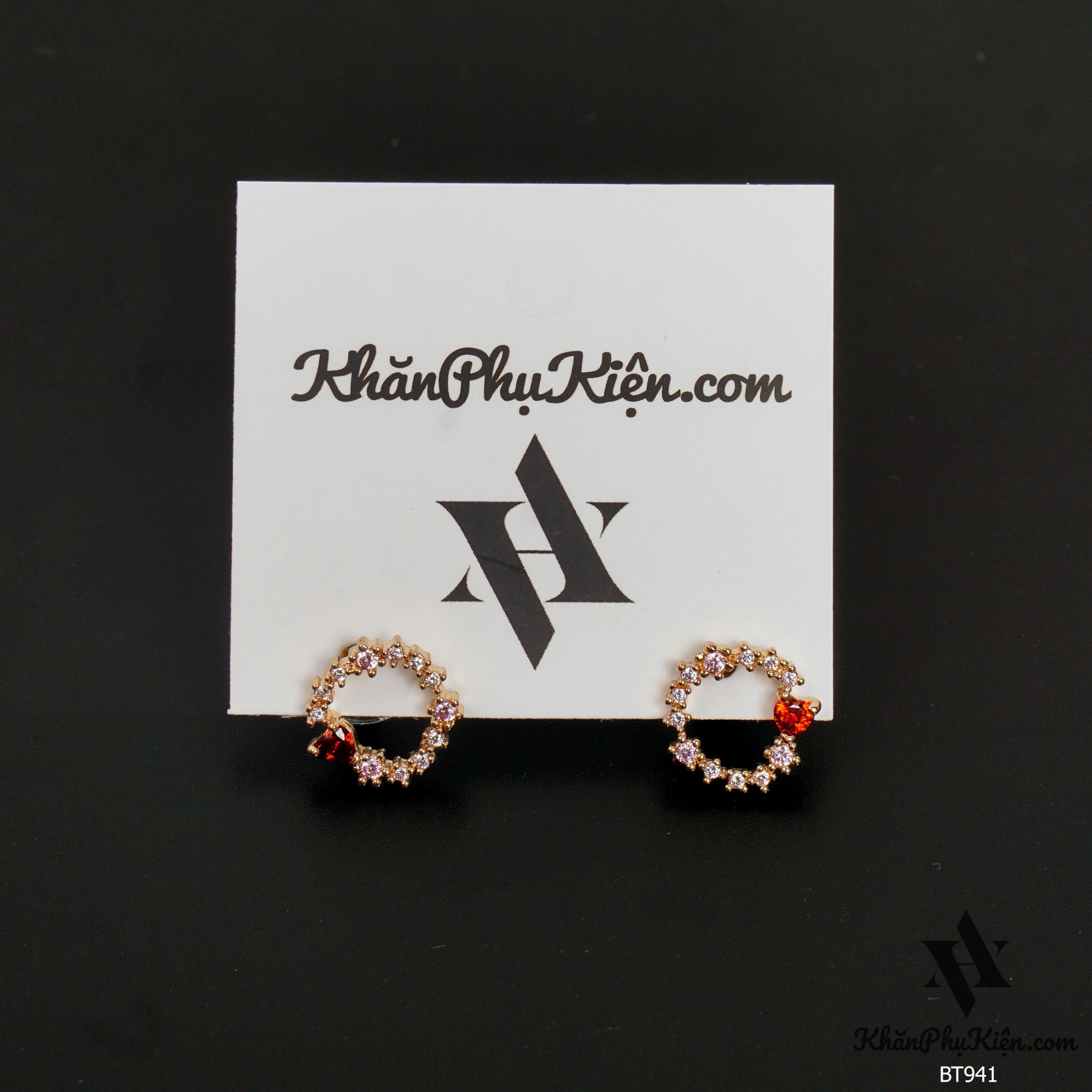 Bông Tai Form Ngắn Hình Tròn Đính Đá Trái Tim Đỏ Mạ Vàng - Mã BT941