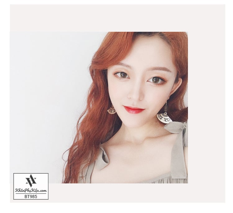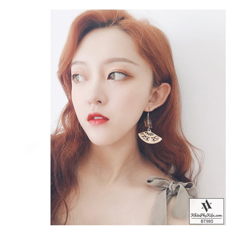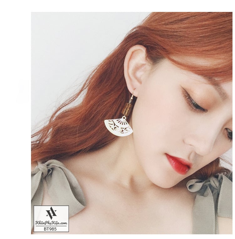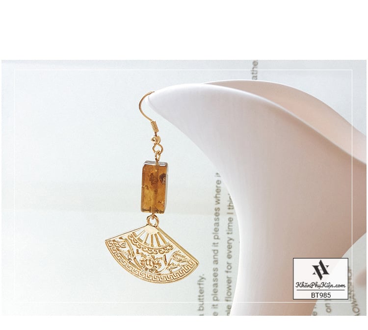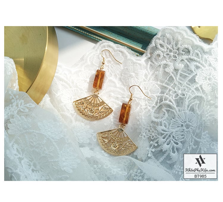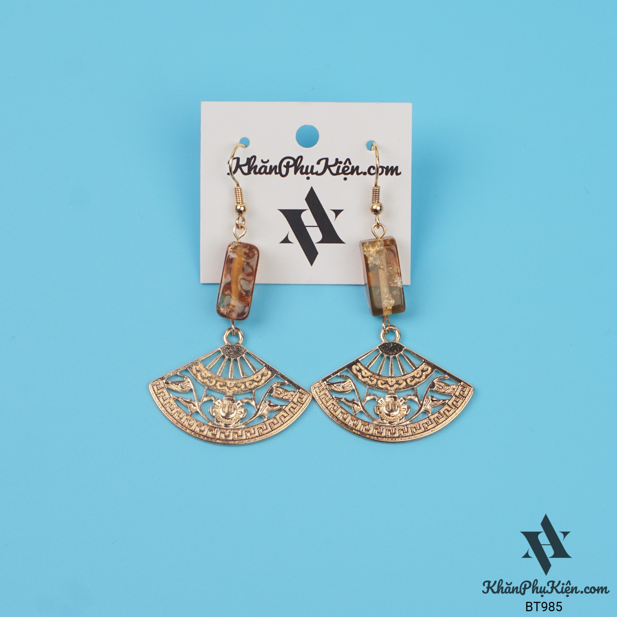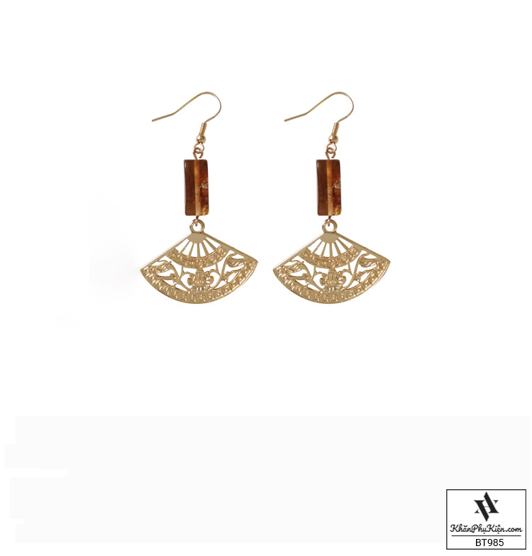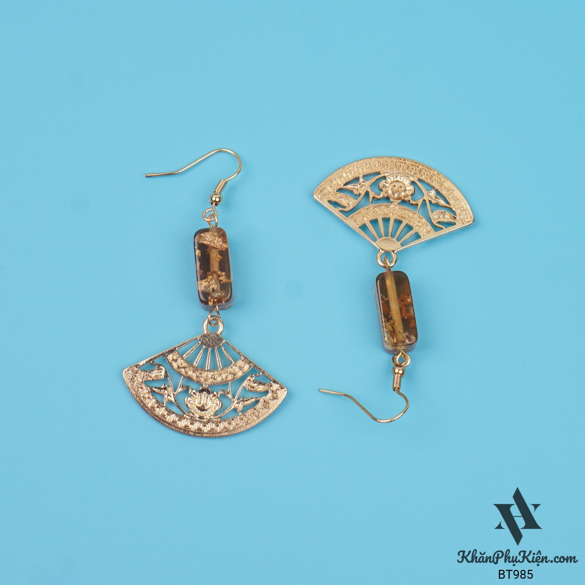 Bông Tai Form Dài Đá Hổ Phách Phối Quạt Mạ Vàng - Mã BT985