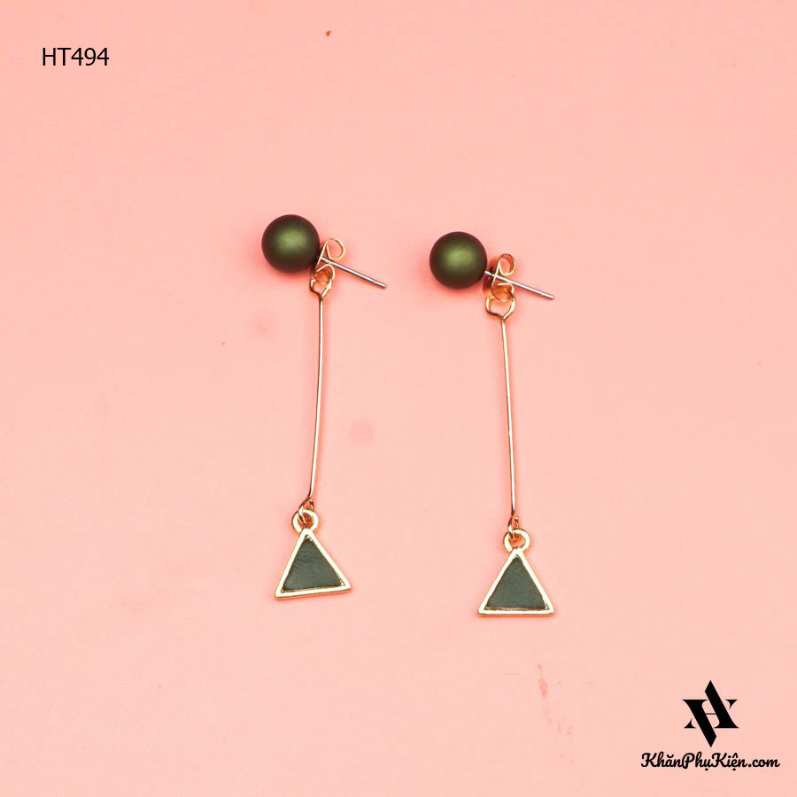 Bông Tai Form Dài Tam Giác Nền Xanh Rêu Mạ Vàng - Mã HT494