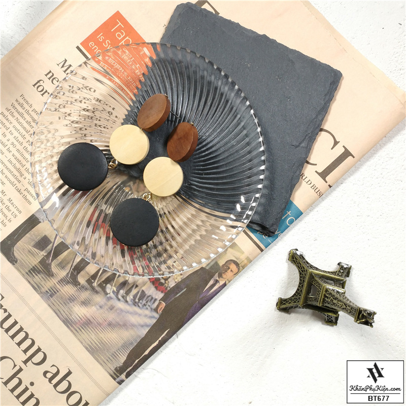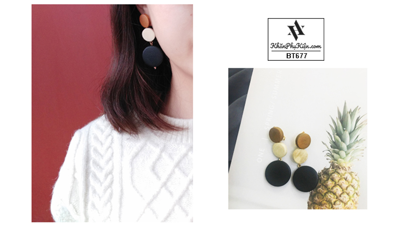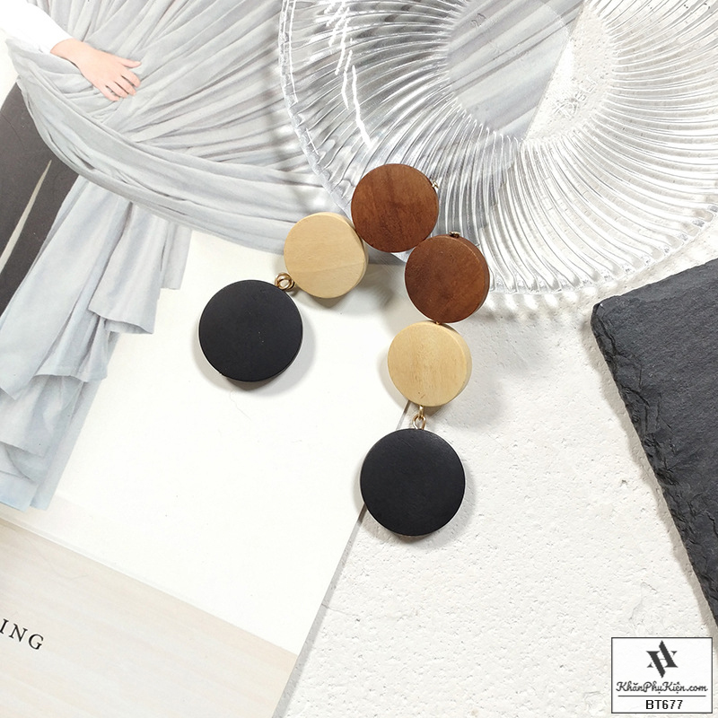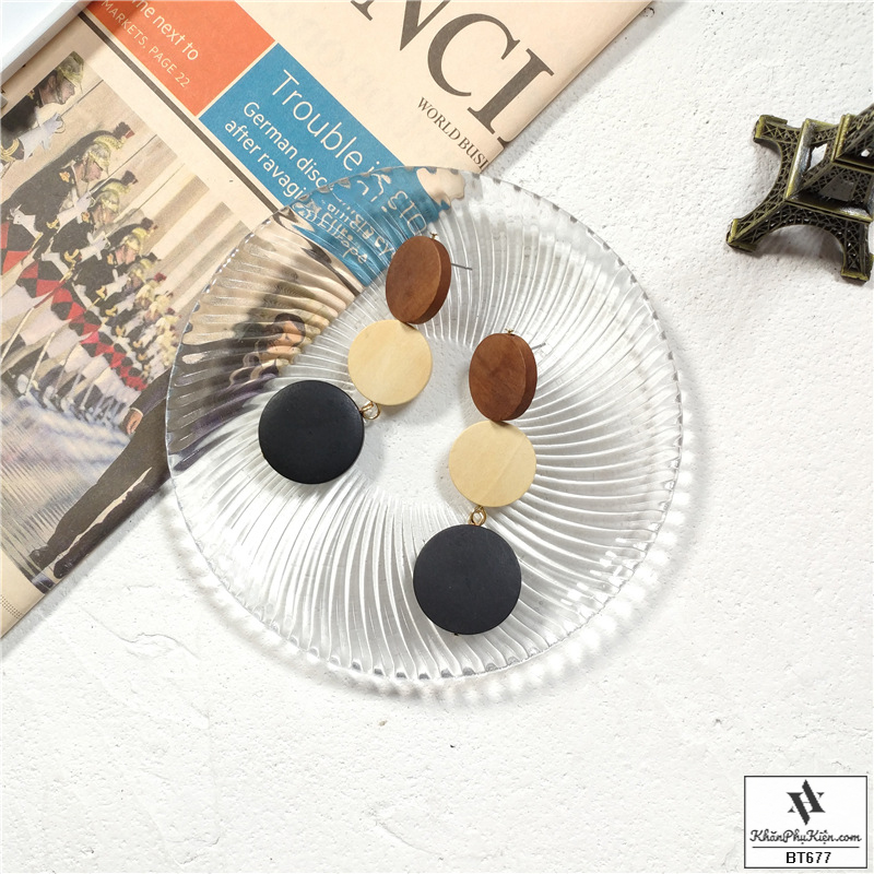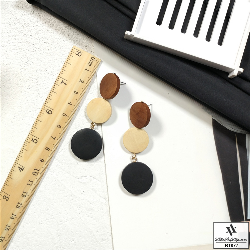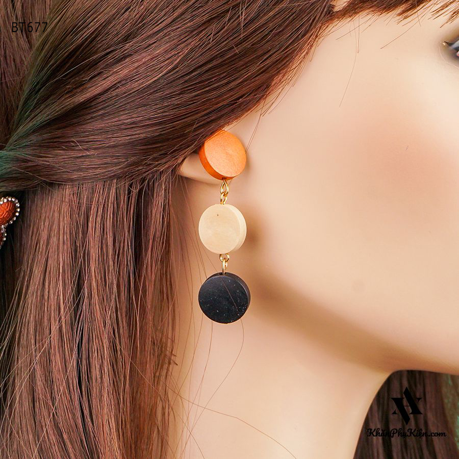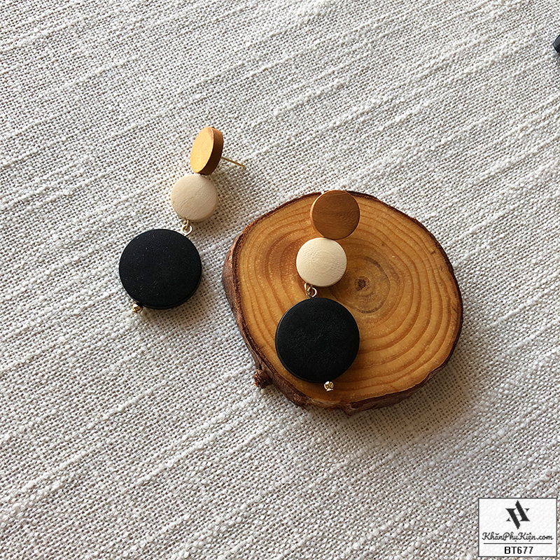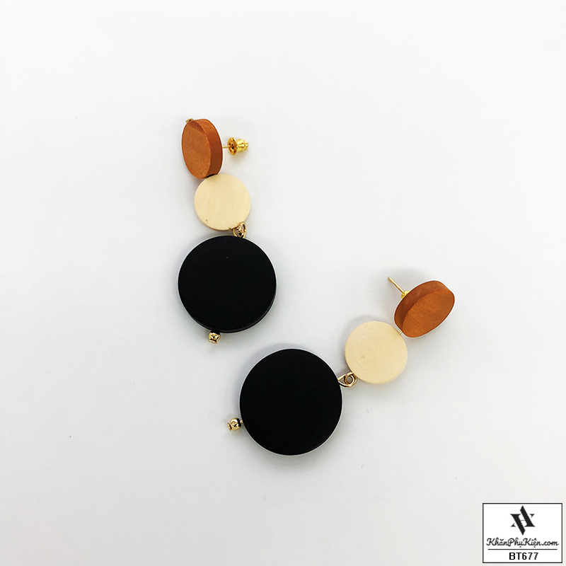 Bông Tai Form Lớn Mạ Vàng Ba Nút Gỗ Màu Đen, Be, Nâu - Mã BT677