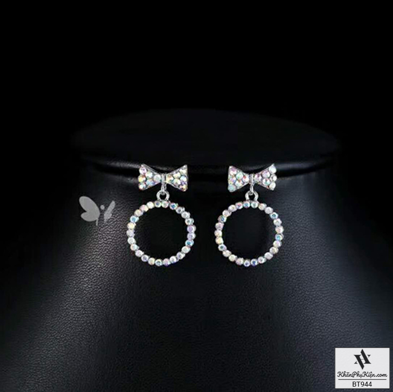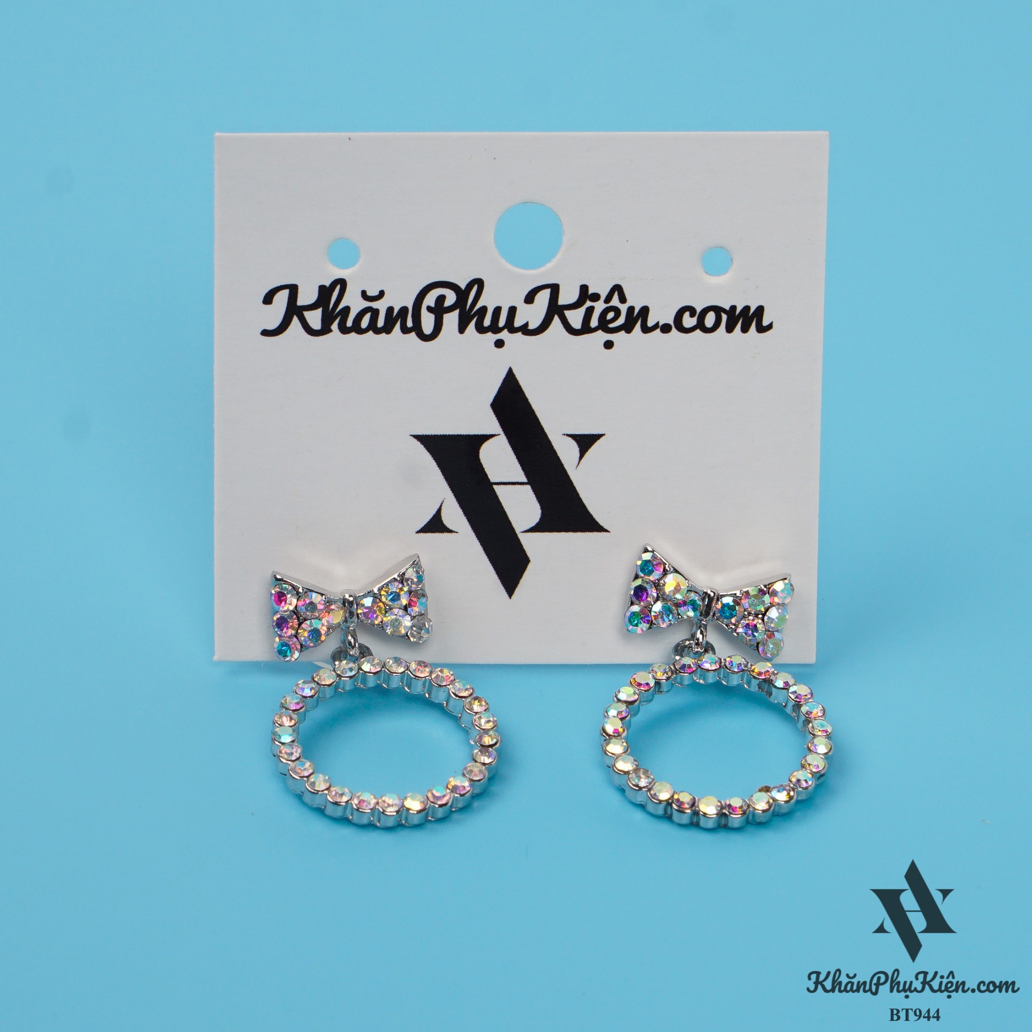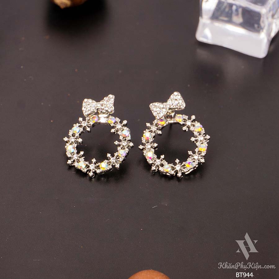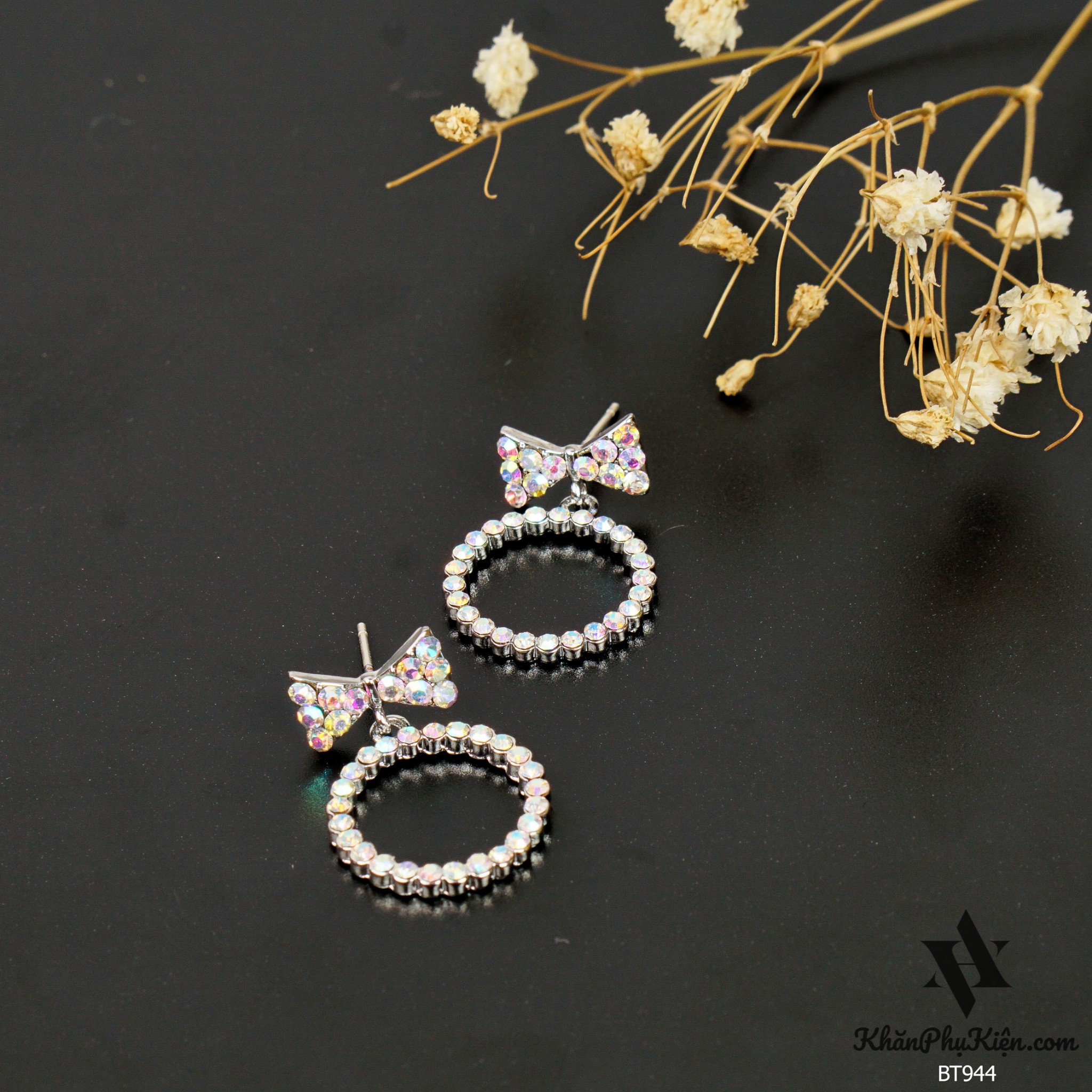 Bông Tai Form Ngắn Chuôi Nơ Phối Hình Tròn Đính Đá Mạ Bạc - Mã BT944