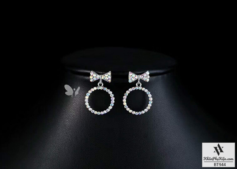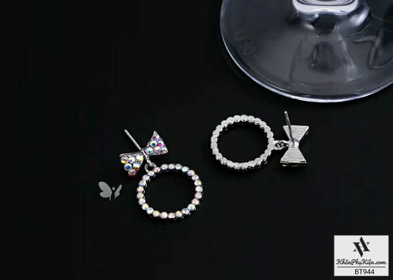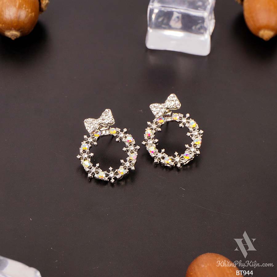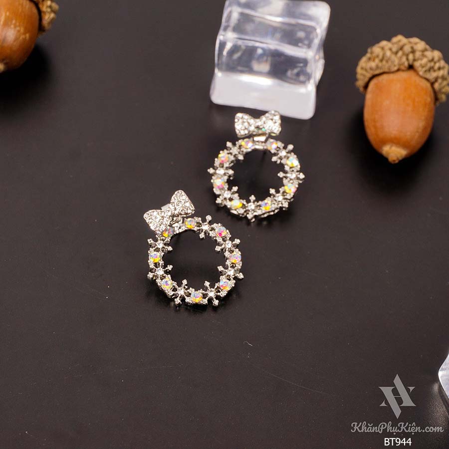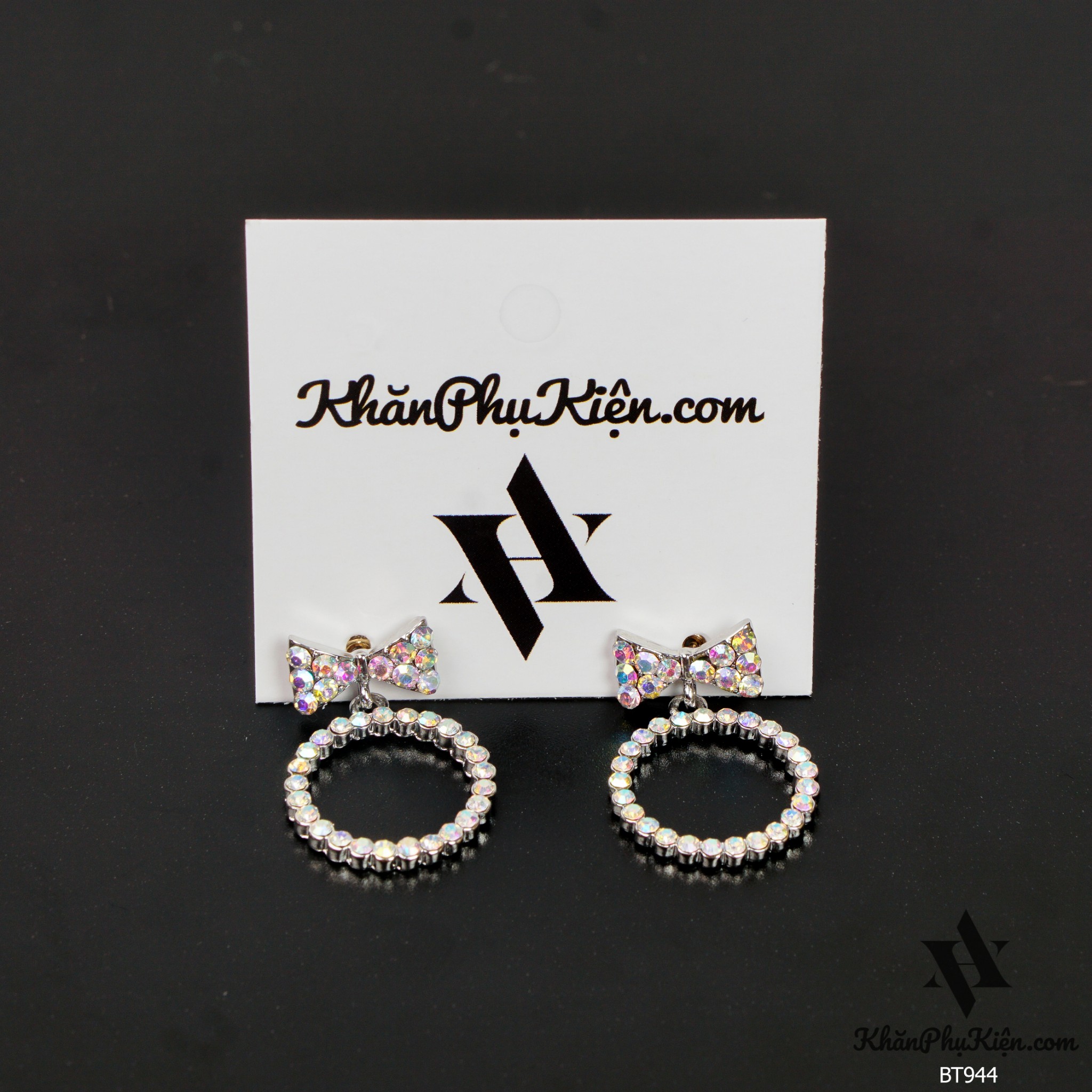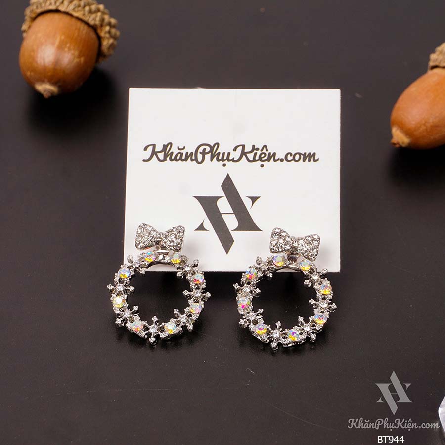 Bông Tai Form Ngắn Chuôi Nơ Phối Hình Tròn Đính Đá Mạ Bạc - Mã BT944