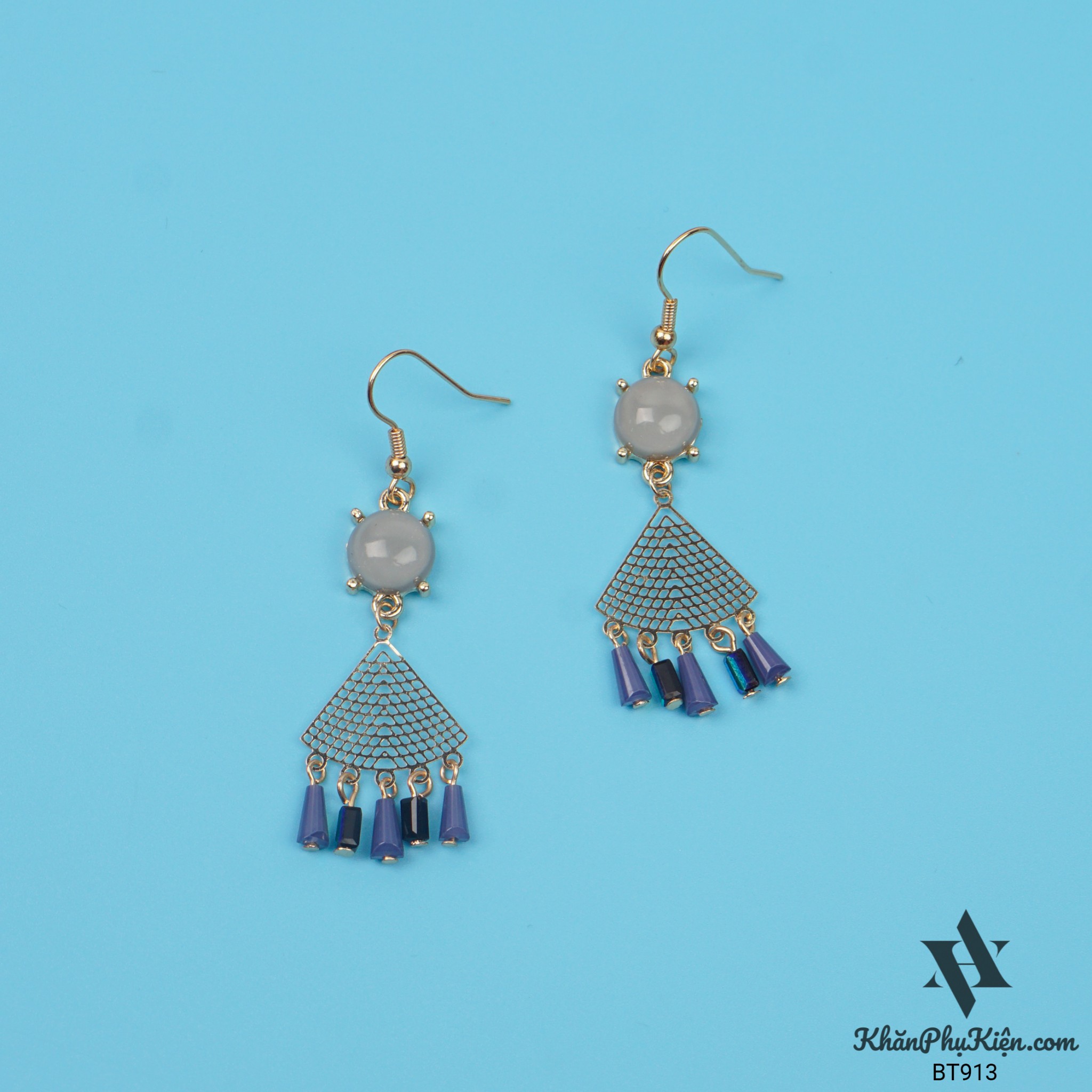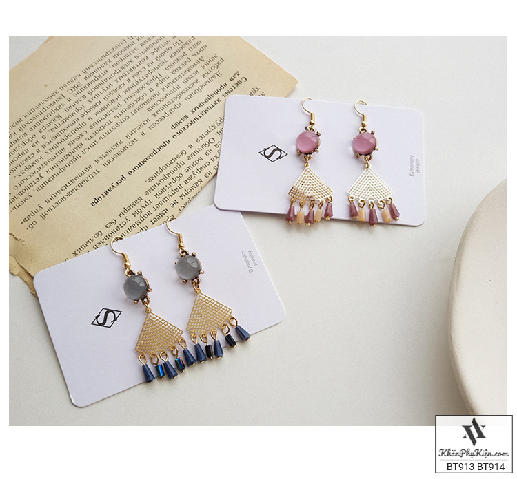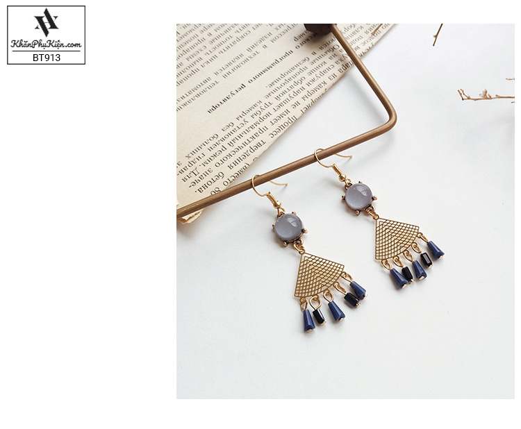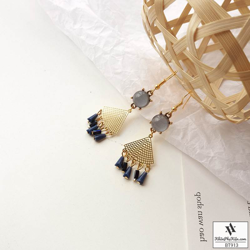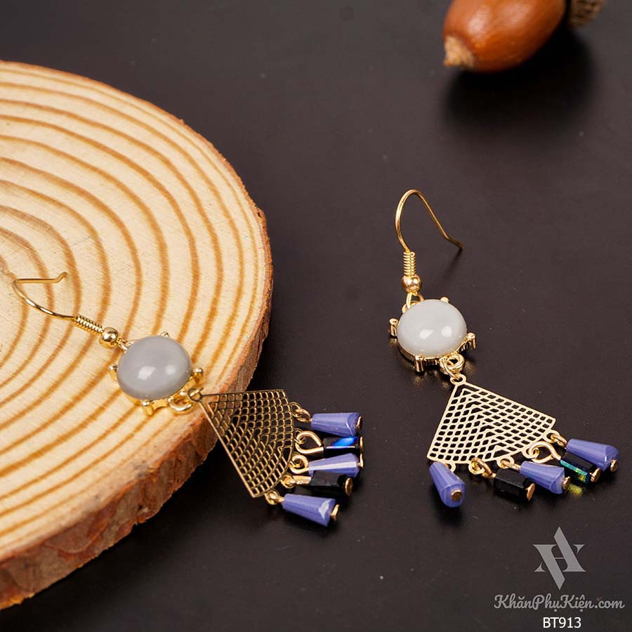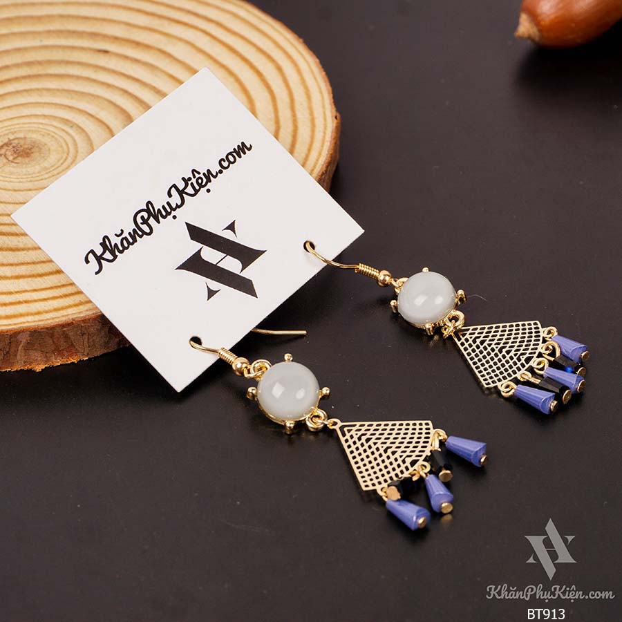 Bông Tai Form Lớn Hình Quạt Tua Rua Phối Đá Xanh Ngọc Bích - Mã BT913