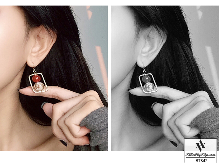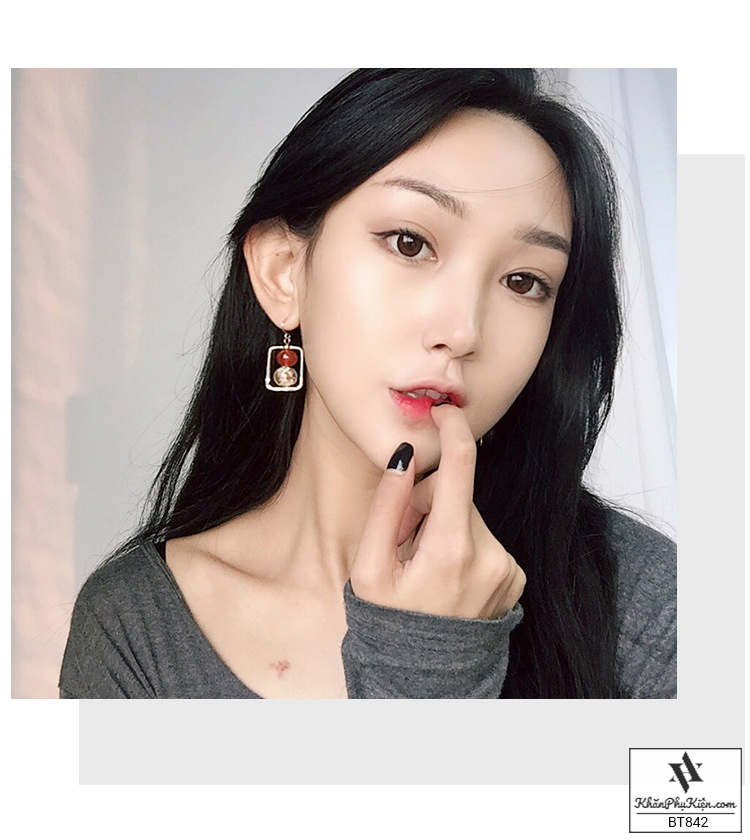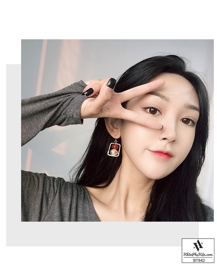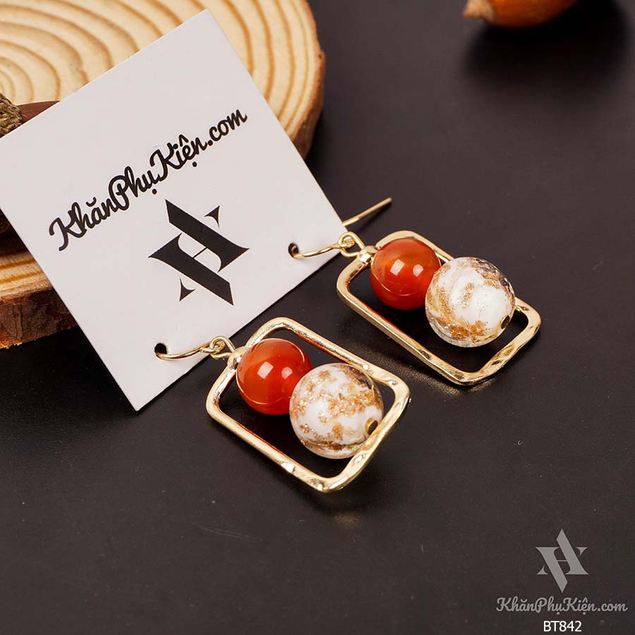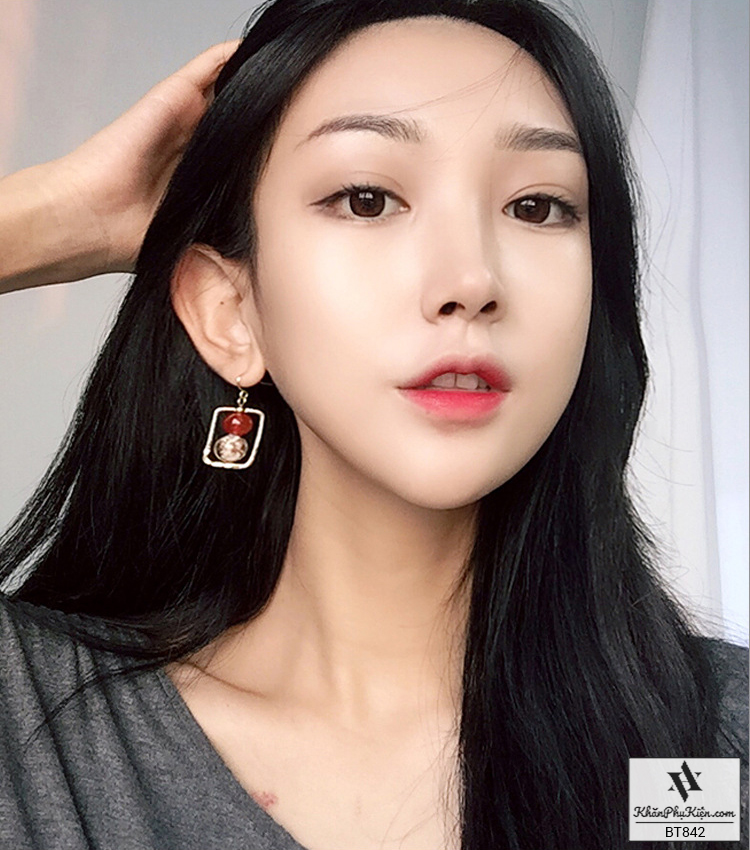 Bông Tai From Dài Hình Chữ Nhật Phối Hạt Đỏ, Trắng Mạ Vàng - Mã BT842