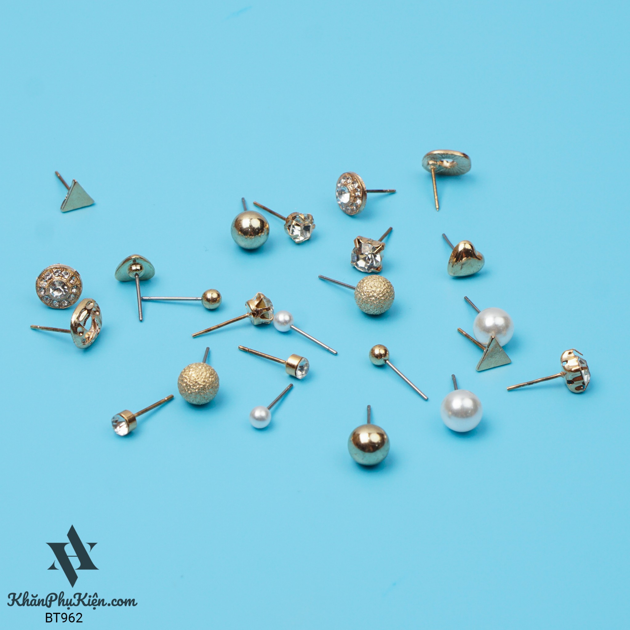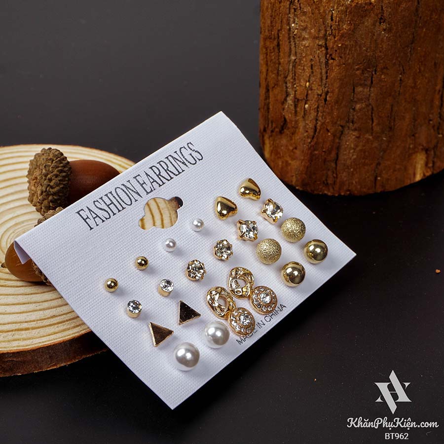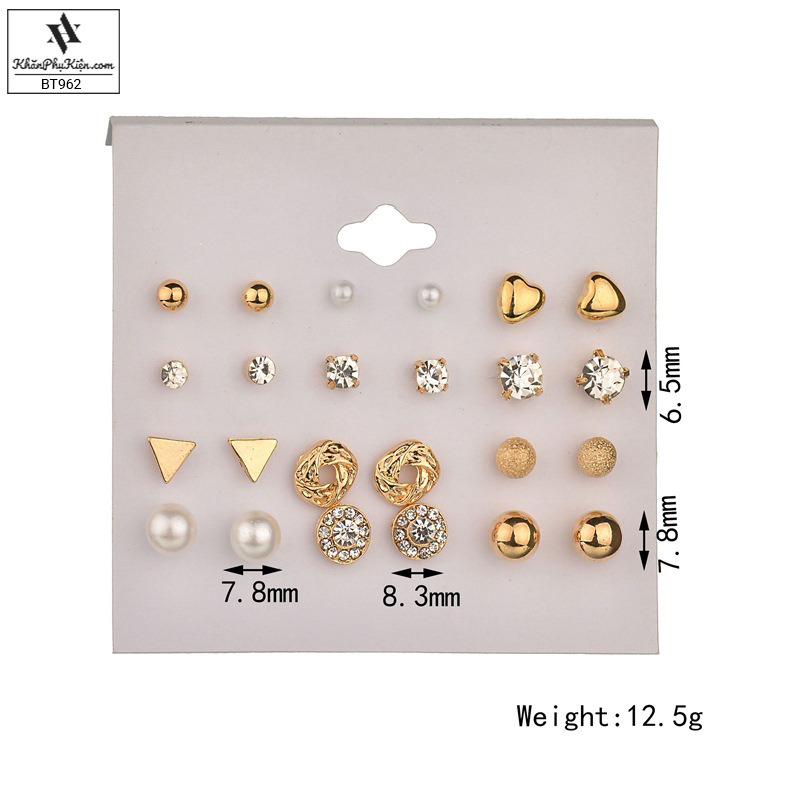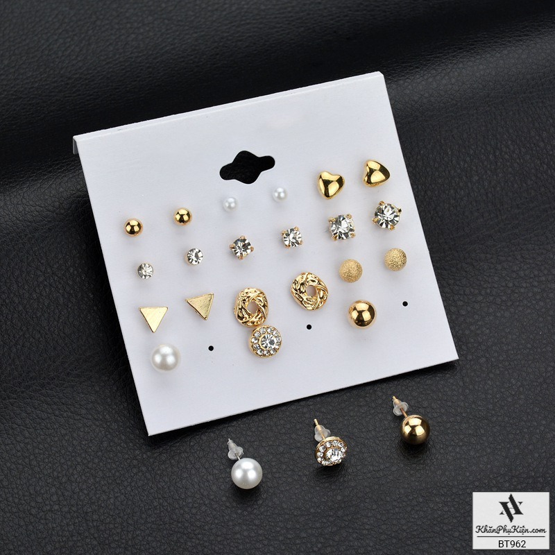 Bông Tai Set 12 Đôi Ngọc Trai, Tam Giác Mạ Vàng - Mã BT962
