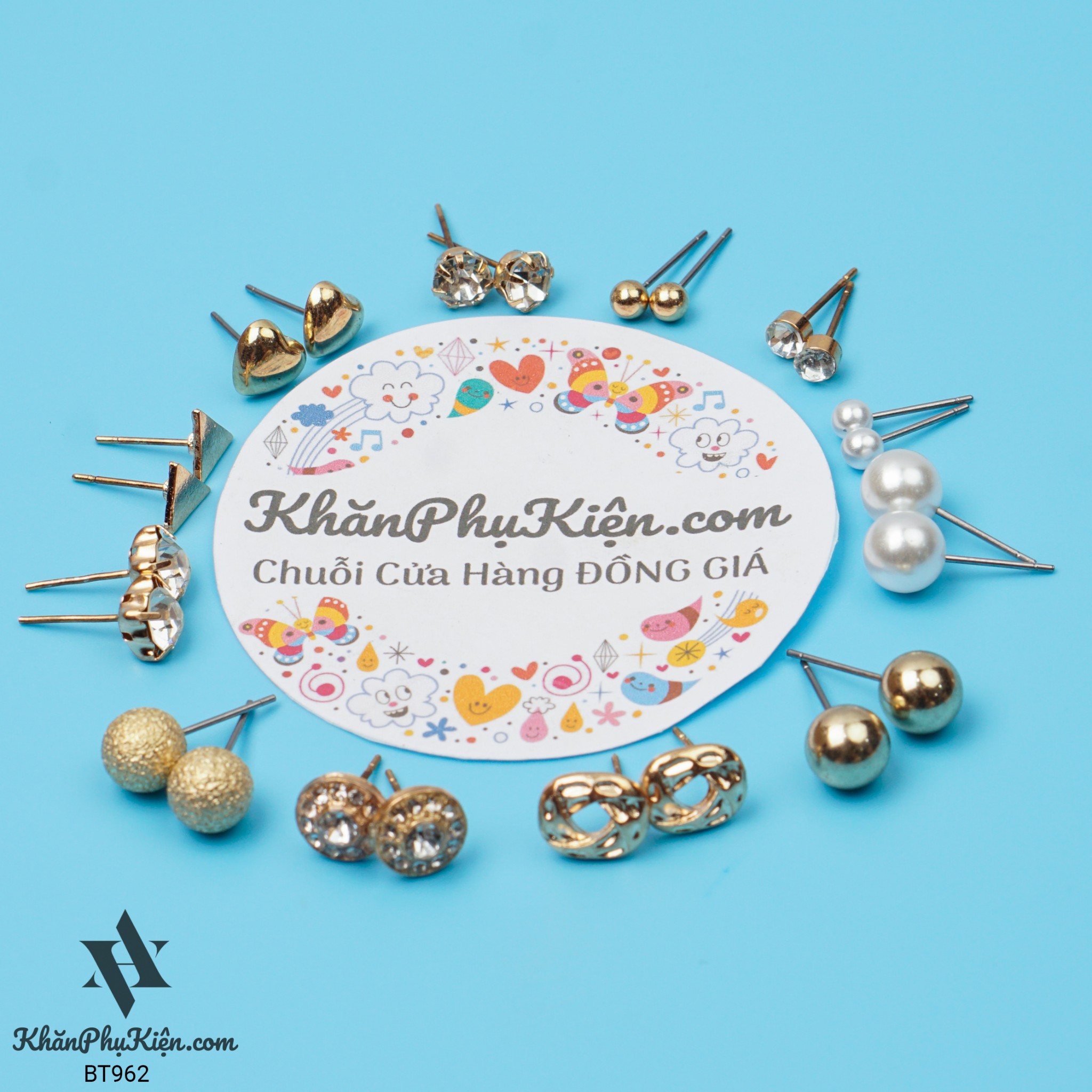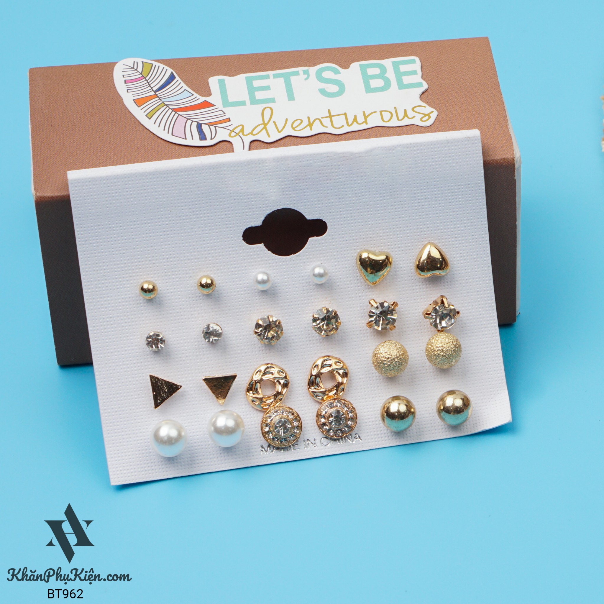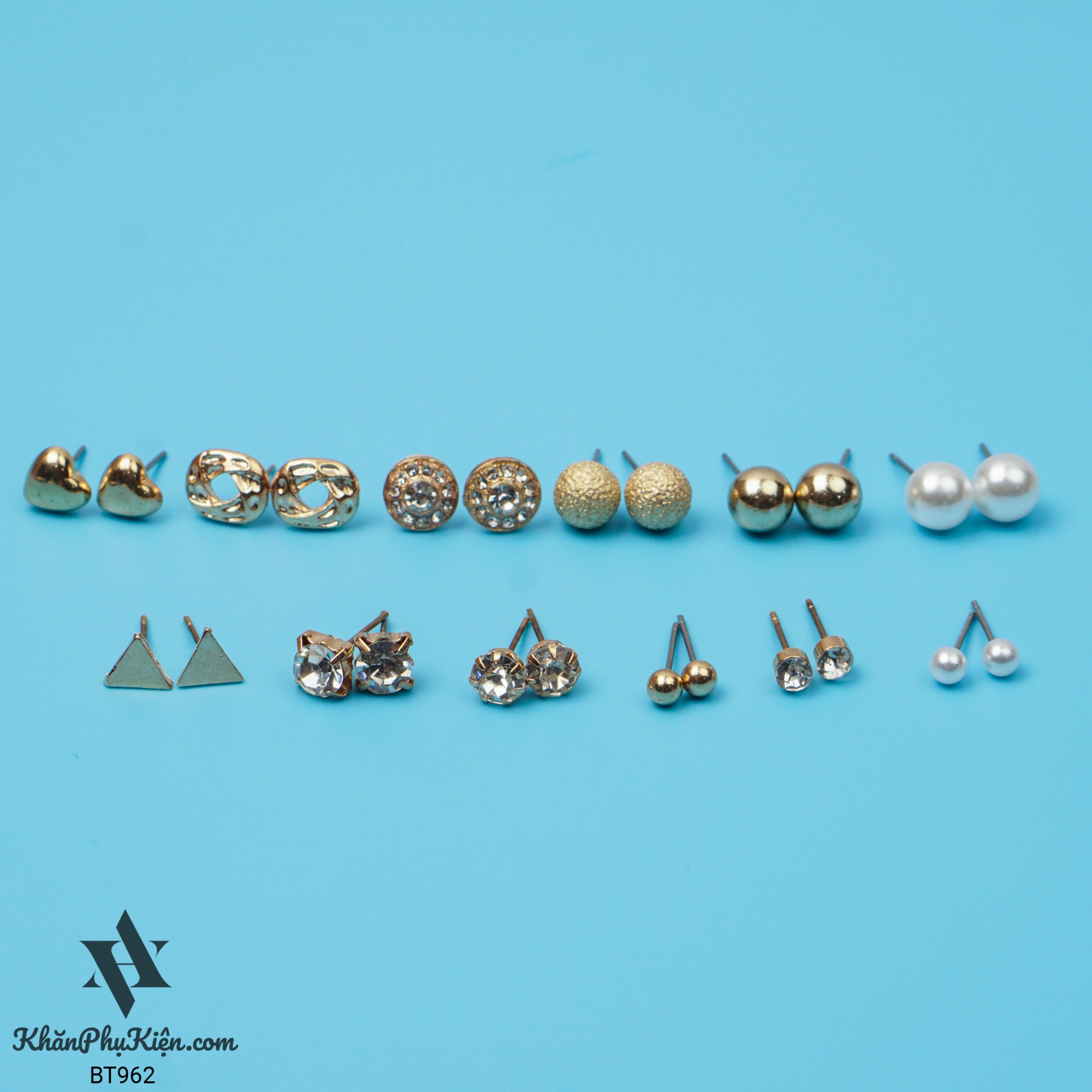 Bông Tai Set 12 Đôi Ngọc Trai, Tam Giác Mạ Vàng - Mã BT962