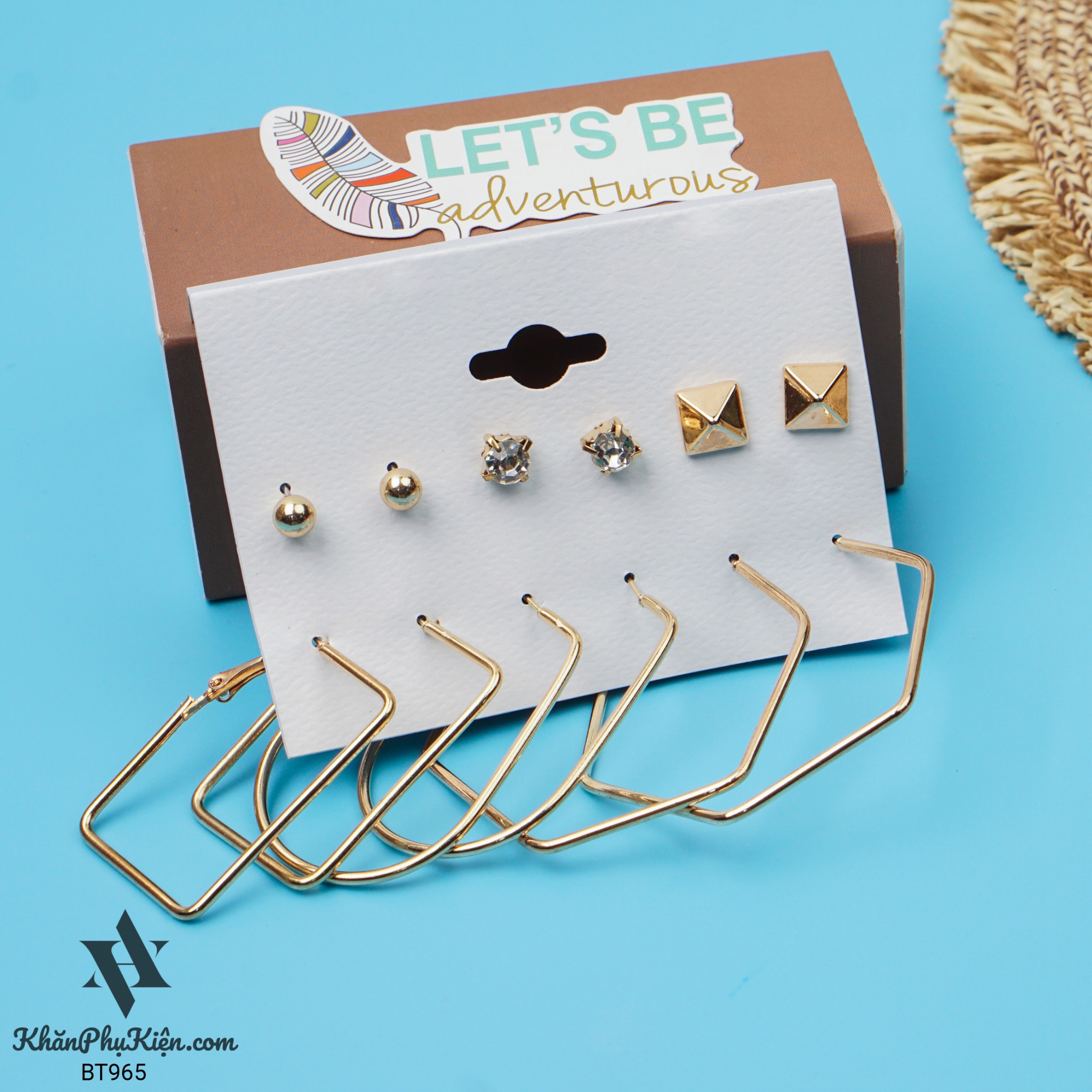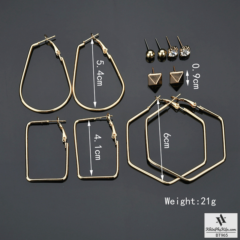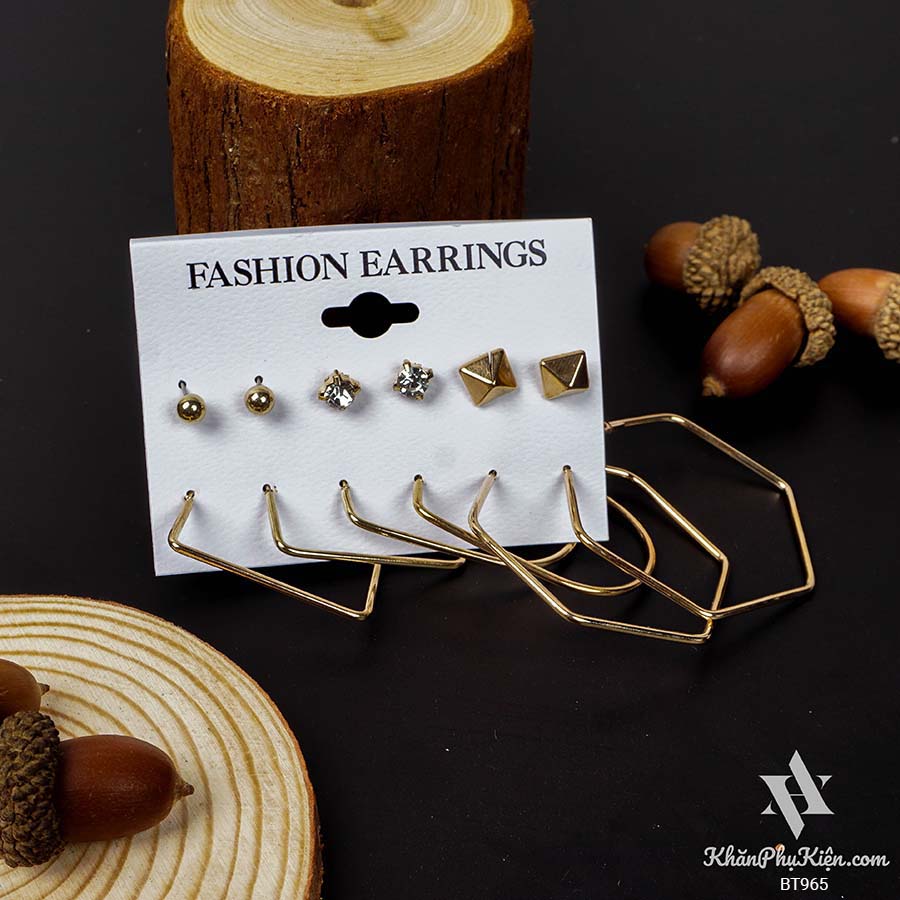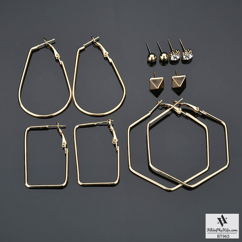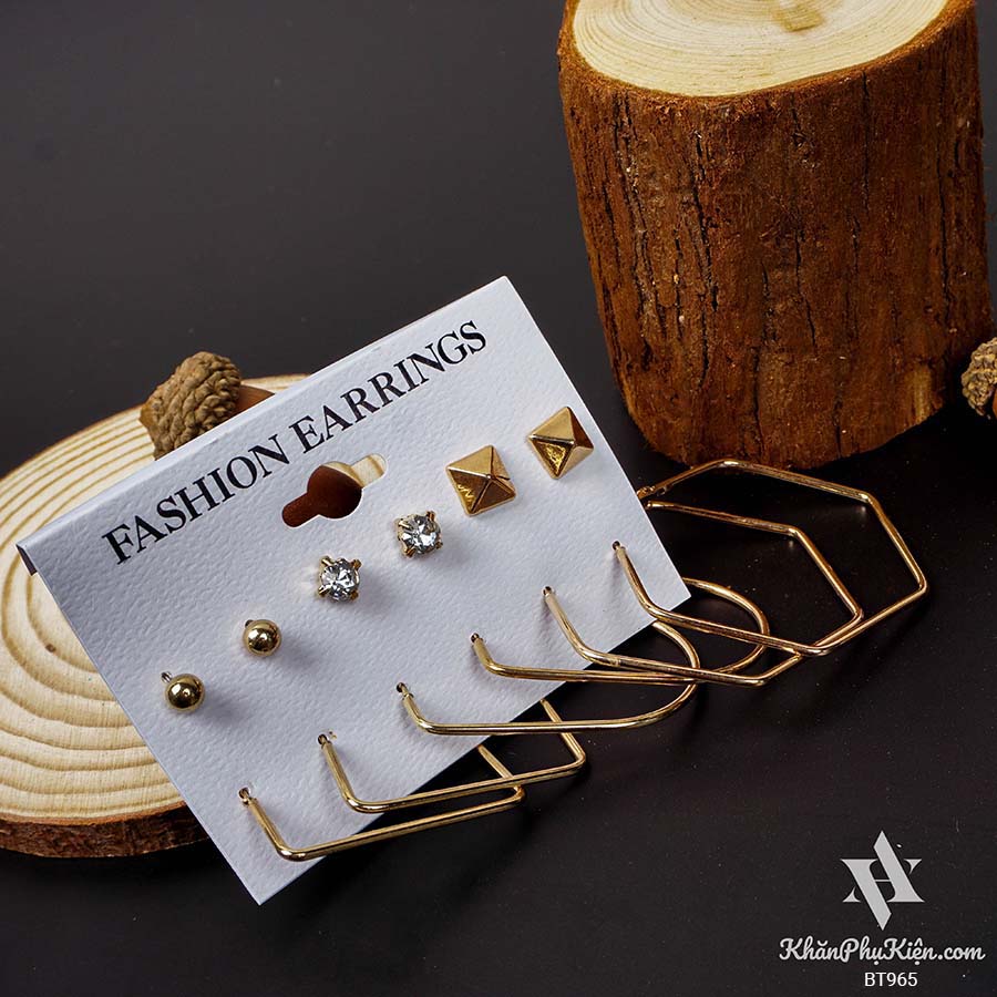 Bông Tai Set 6 Đôi Hạt Tròn, Hình Lục Giác Mạ Vàng - Mã BT965