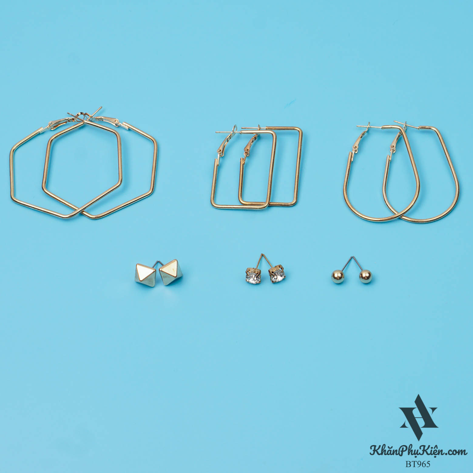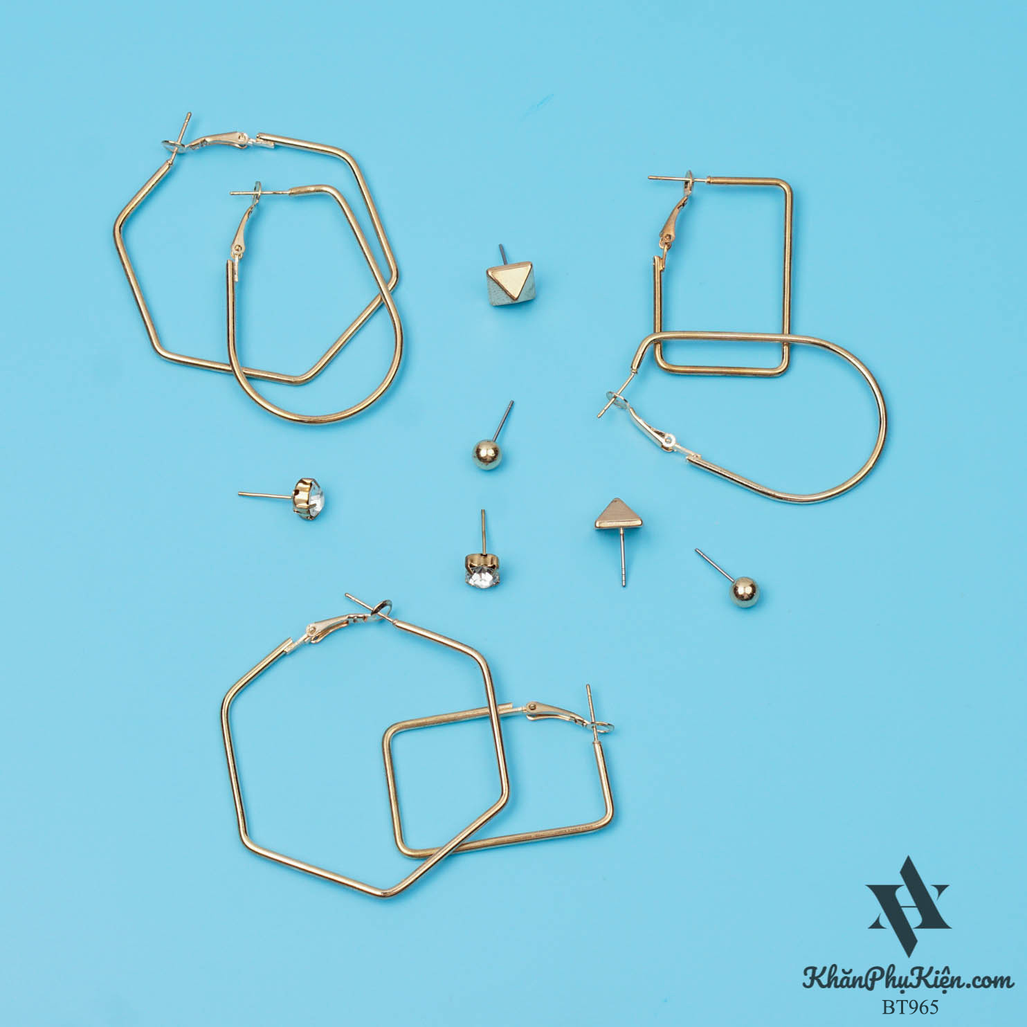 - Đặc điểm: Set 6 đôi hạt tròn, hình lục giác mạ vàng
