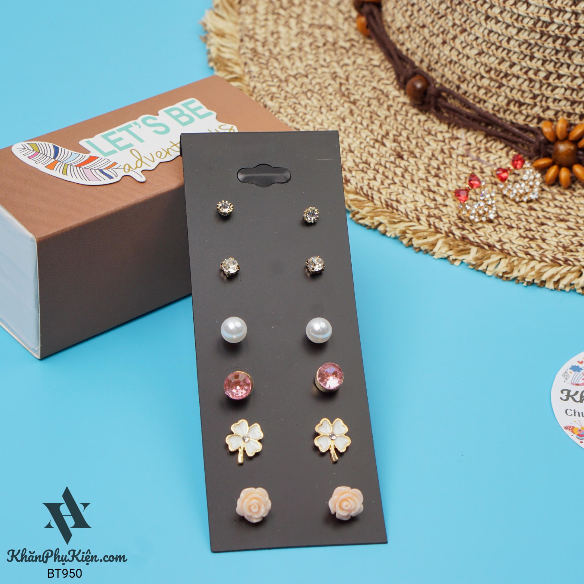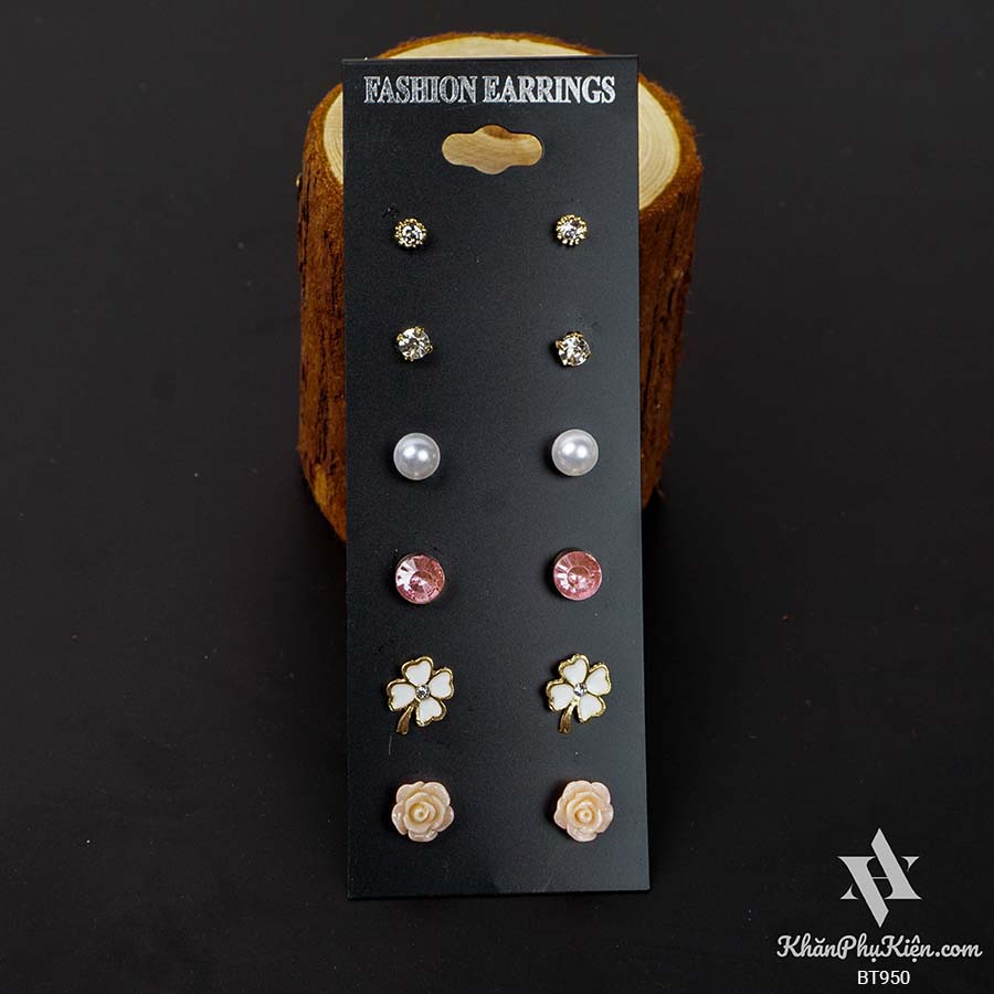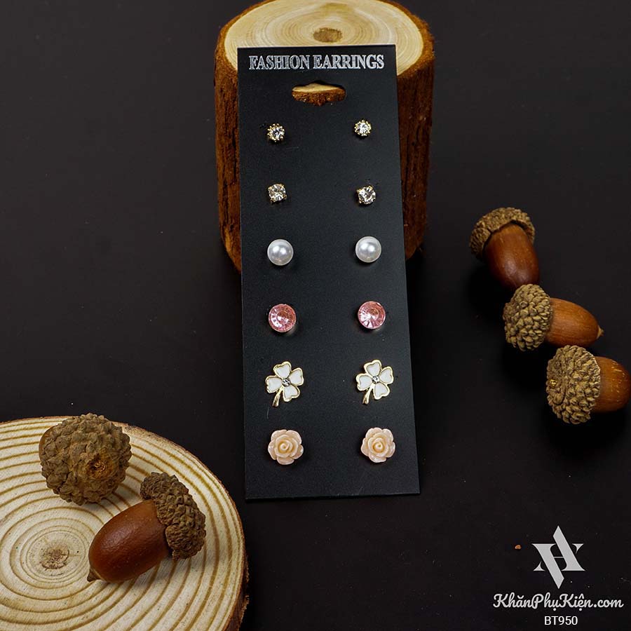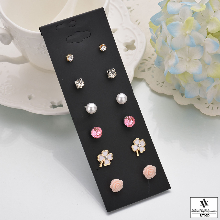Bông Tai Set 6 Đôi Hoa Hồng, Đá Hồng Mạ Vàng - Mã BT950