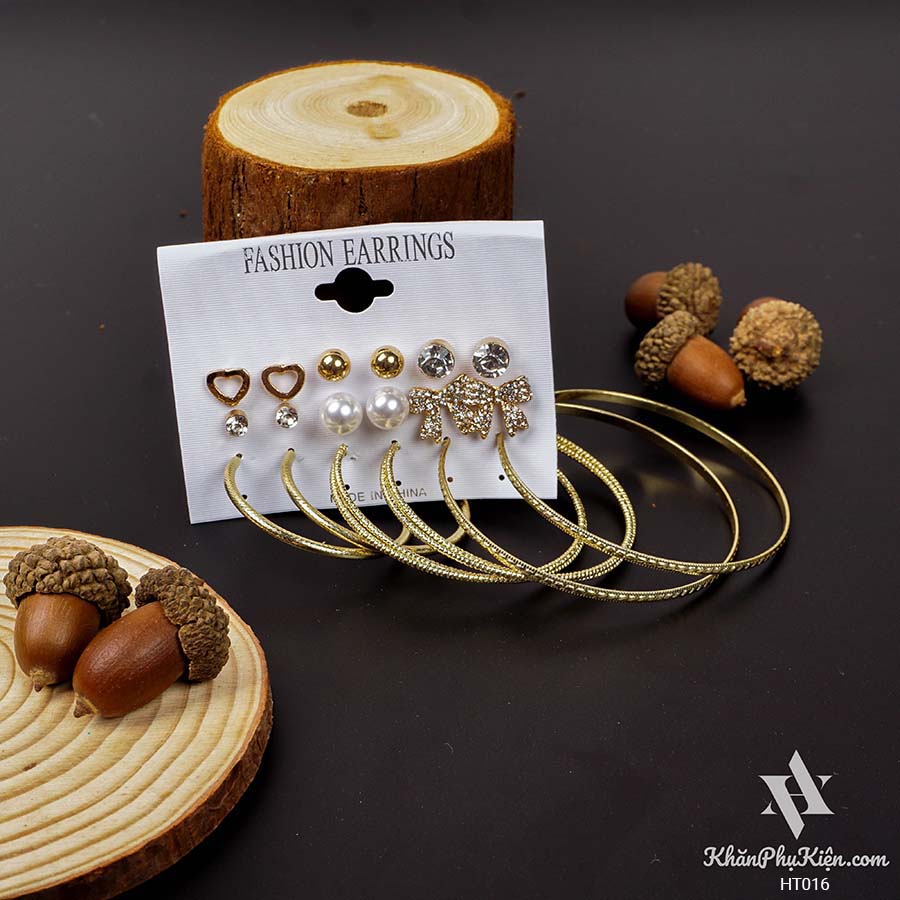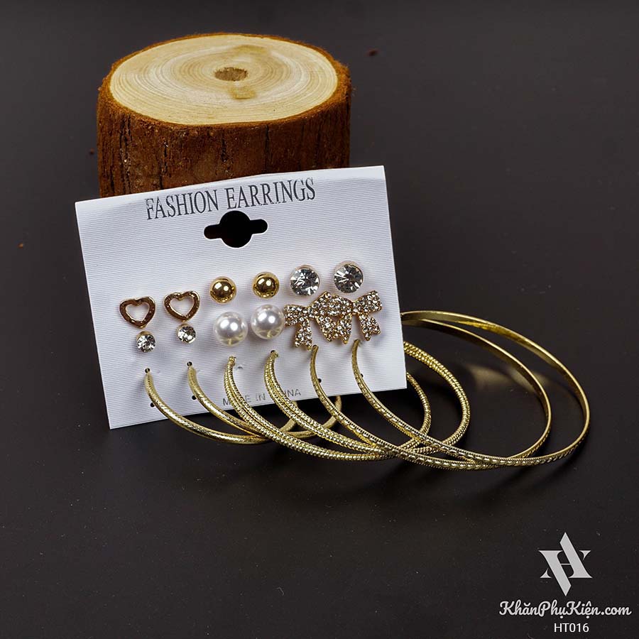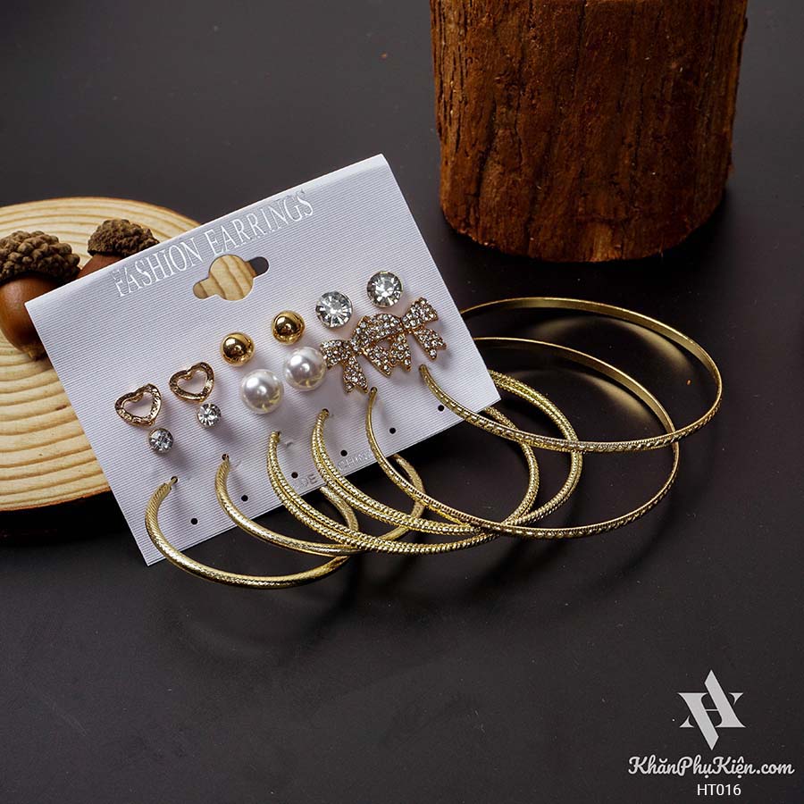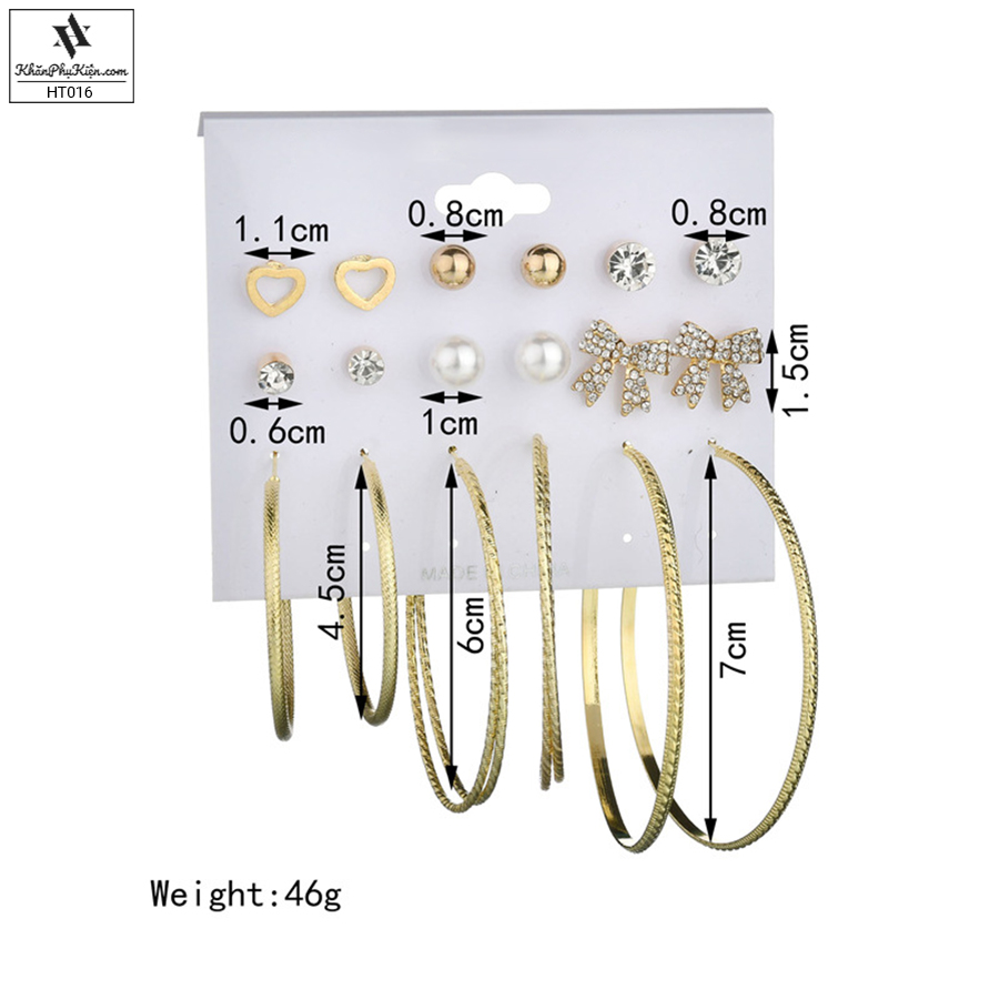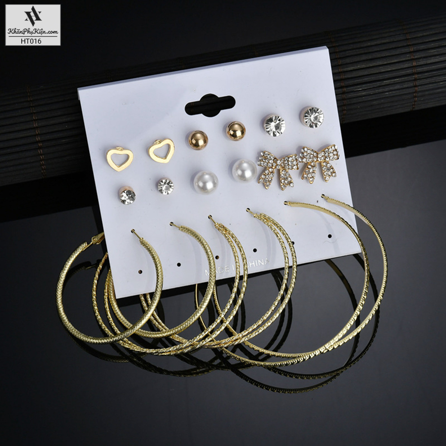 Bông Tai Set 9 Đôi Nơ Lớn Đính Đá, Vòng Tròn Lớn Mạ Vàng - Mã HT016