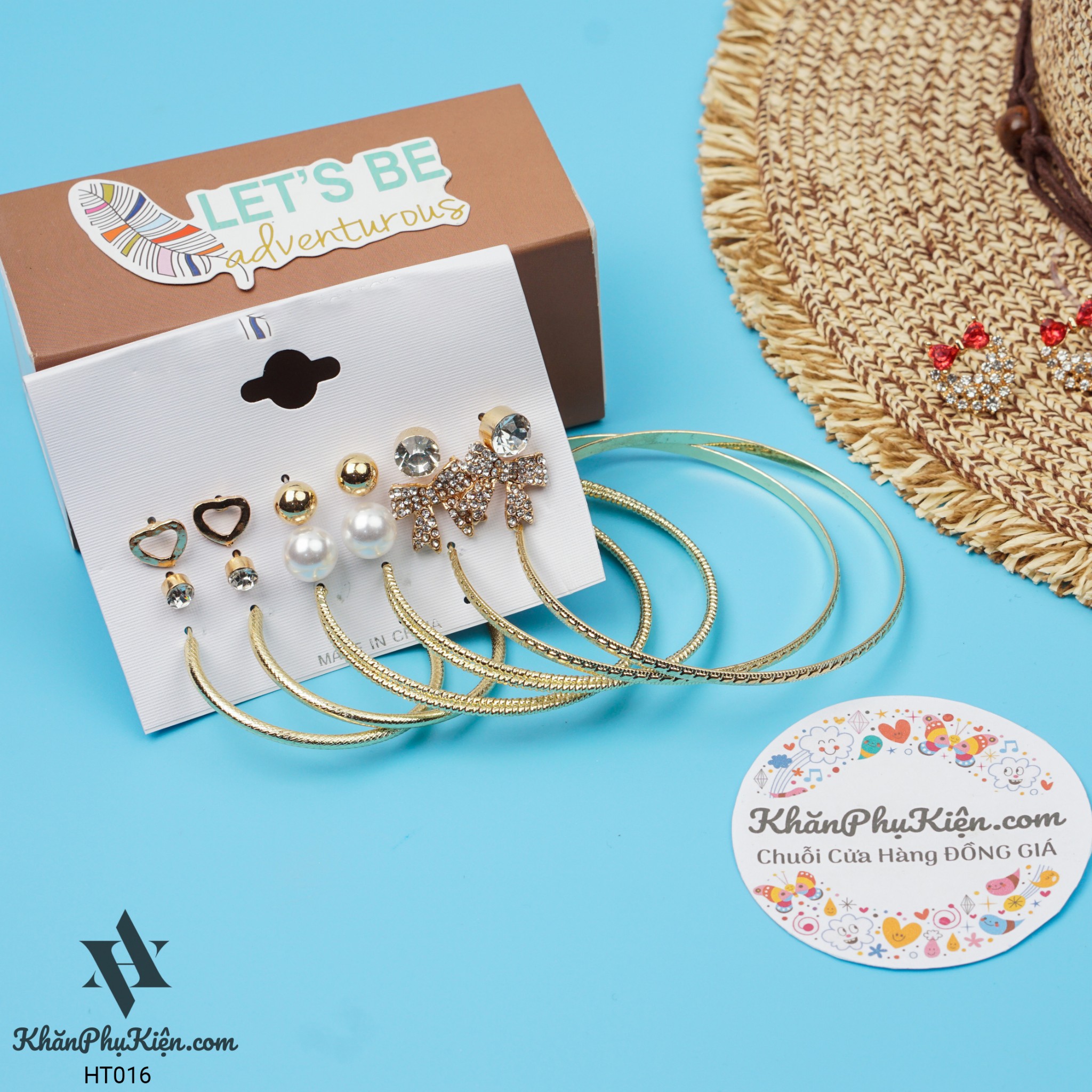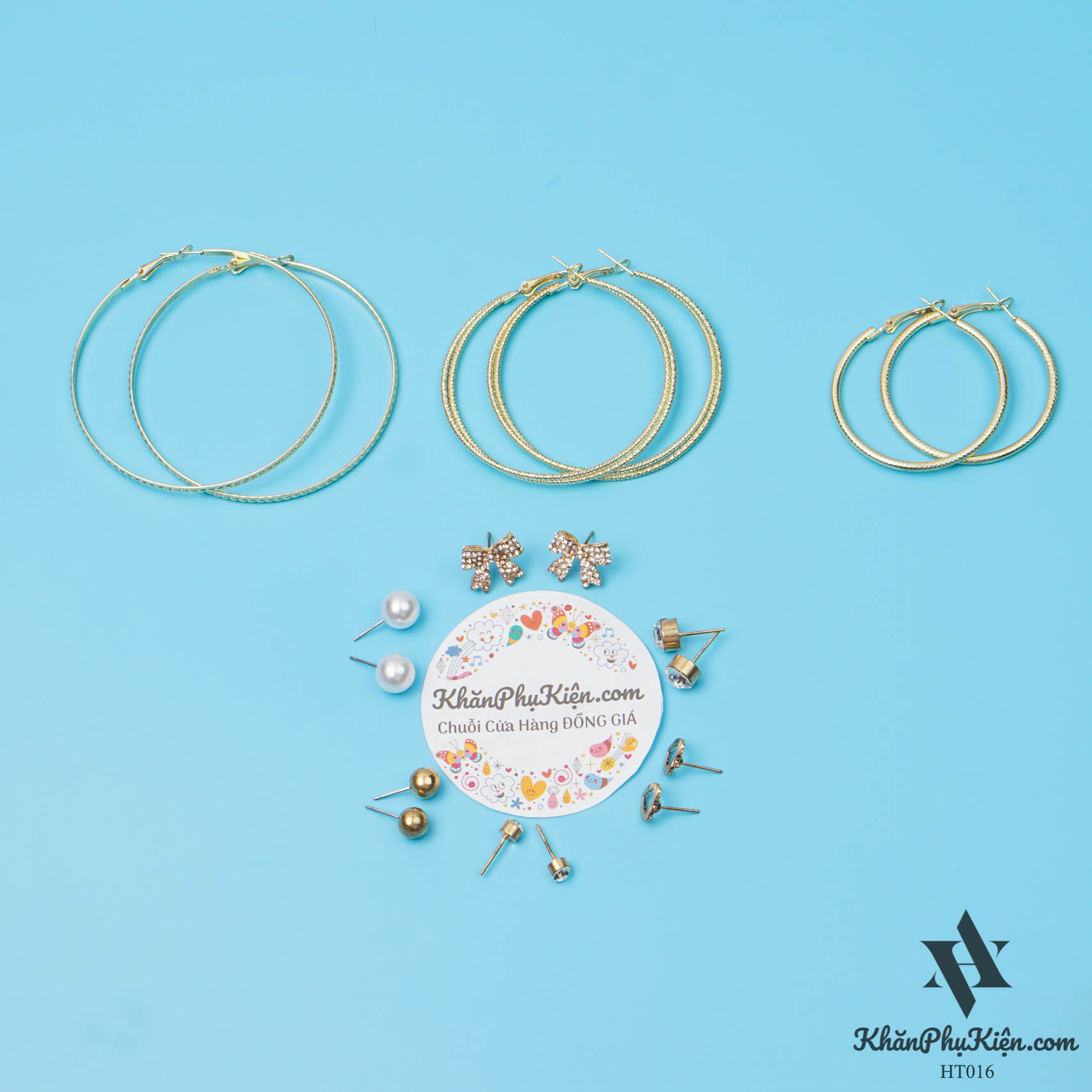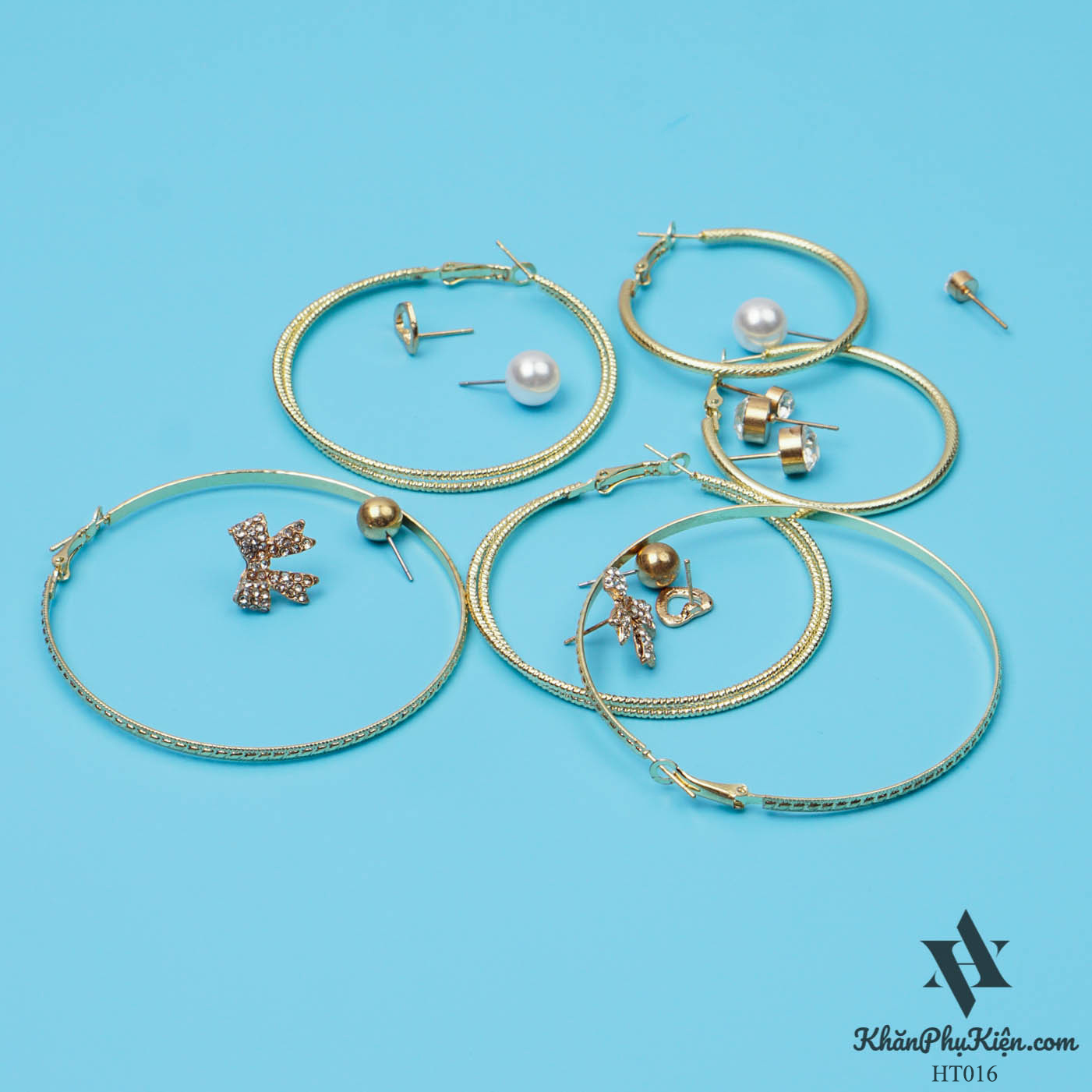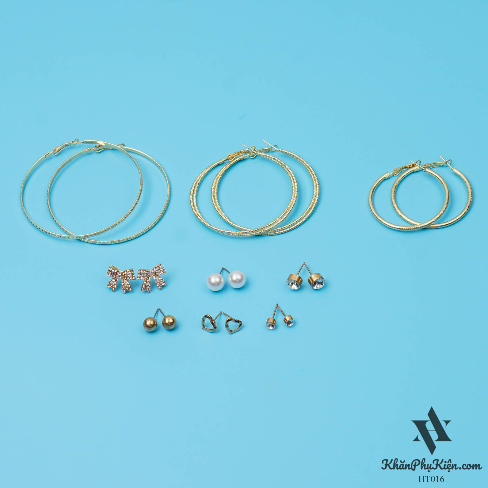 Bông Tai Set 9 Đôi Nơ Lớn Đính Đá, Vòng Tròn Lớn Mạ Vàng - Mã HT016