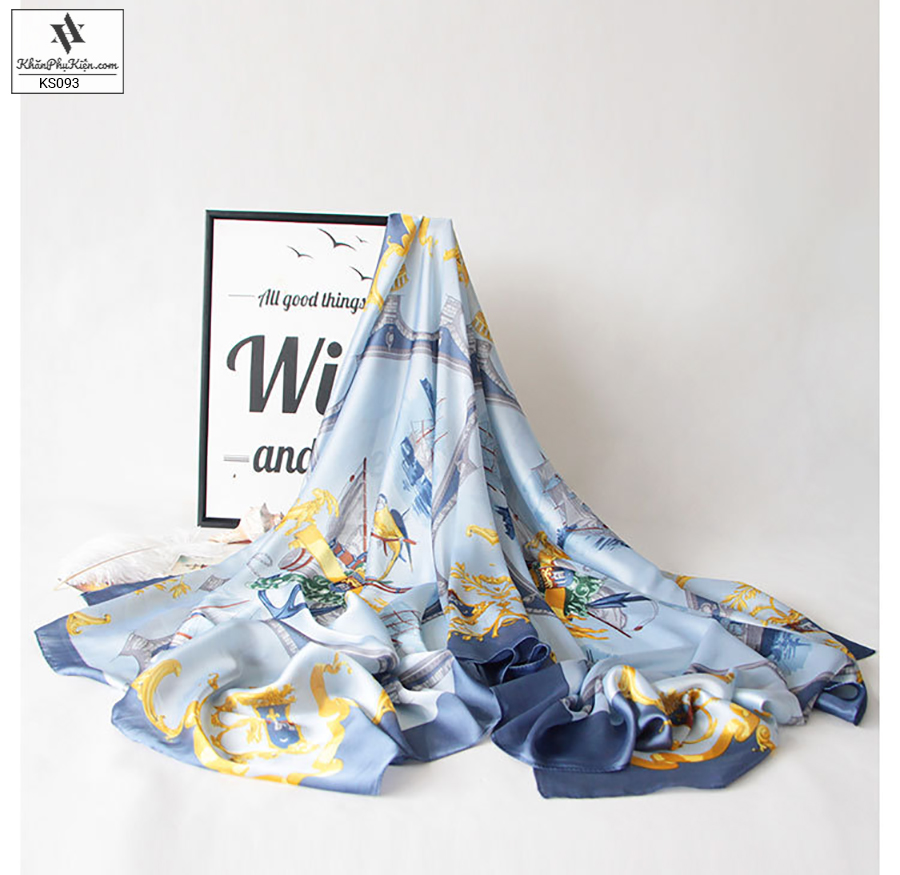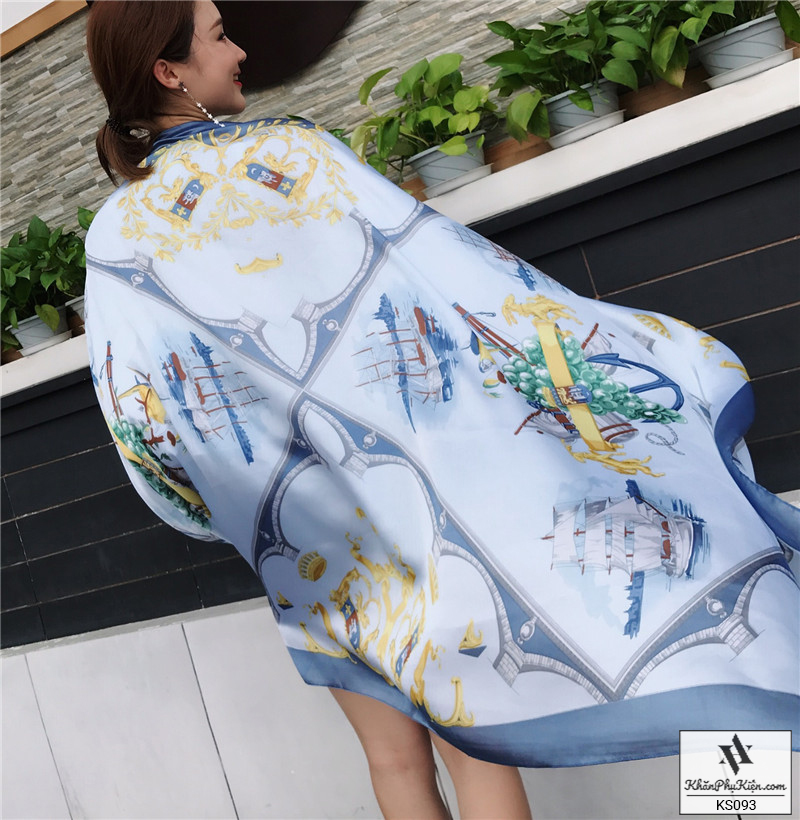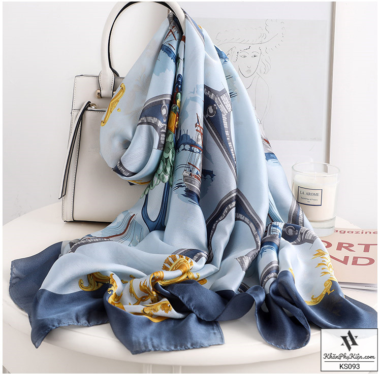 Khăn Choàng Cổ Lụa Họa Tiết Cánh Buồm Viền Màu Xanh - Mã KS093