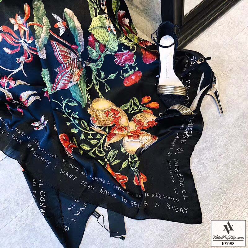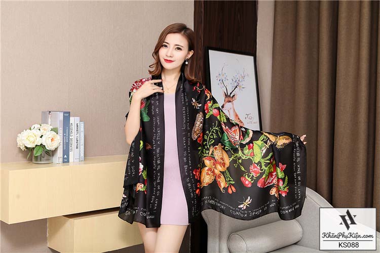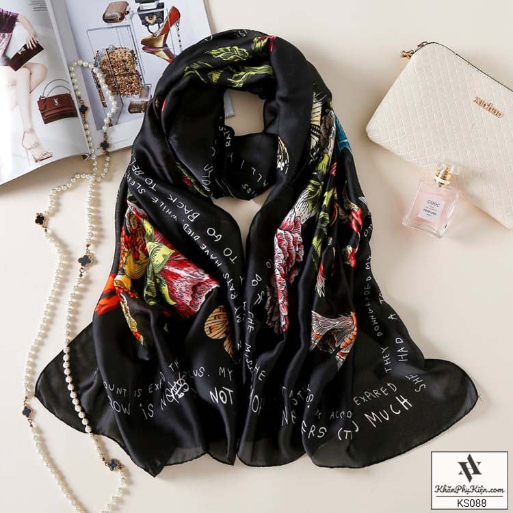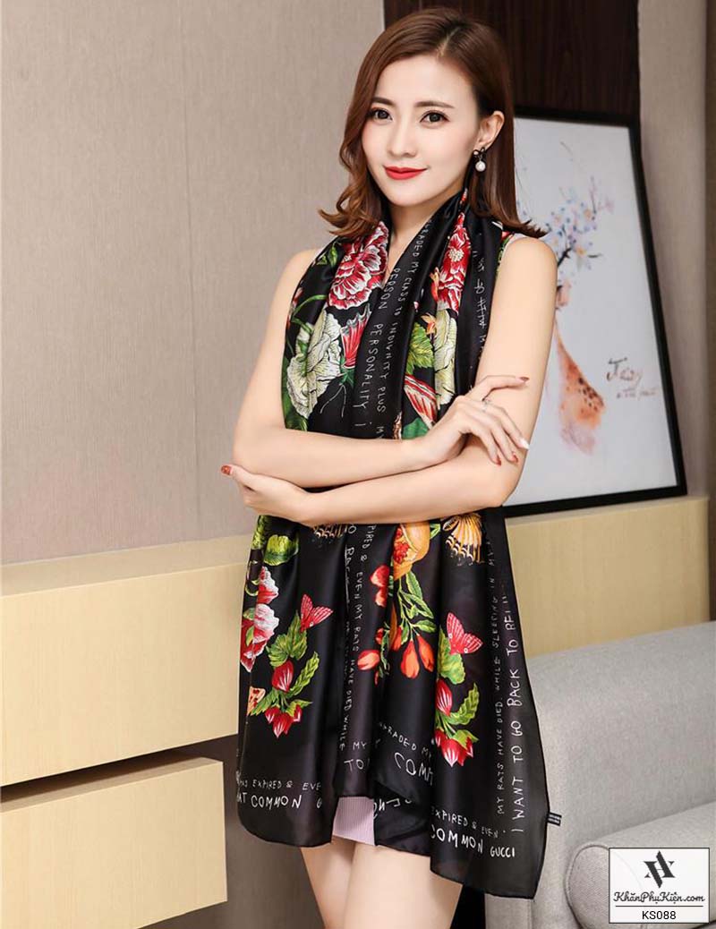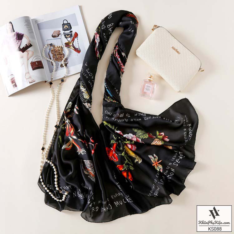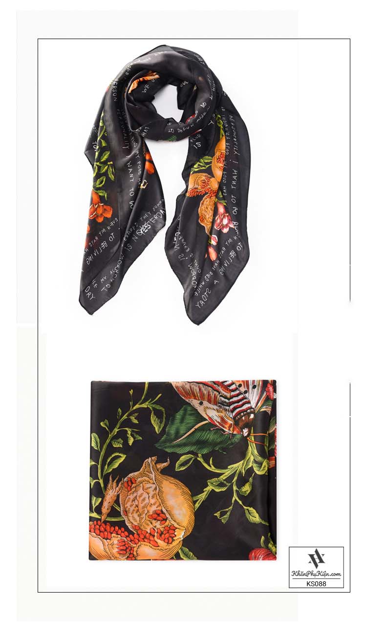 Khăn Choàng Cổ Lụa Họa Tiết Hoa Nền Màu Vàng Đen - Mã KS088