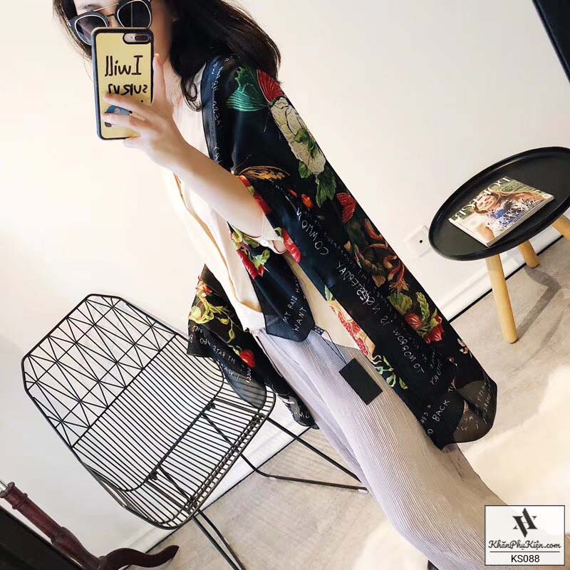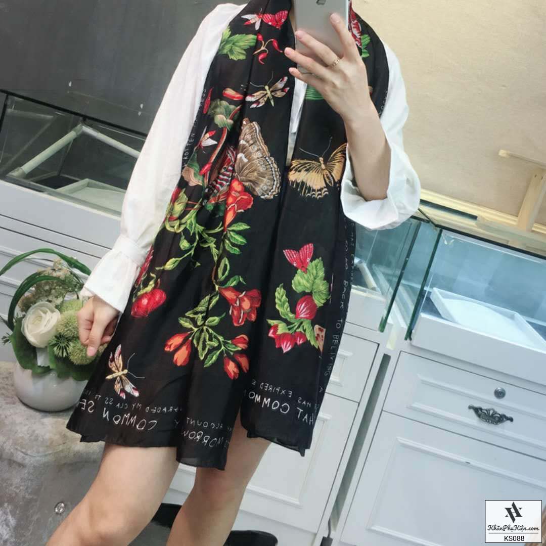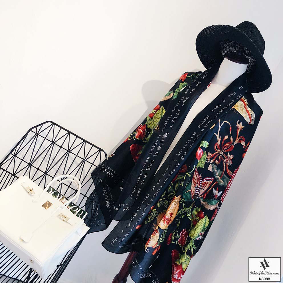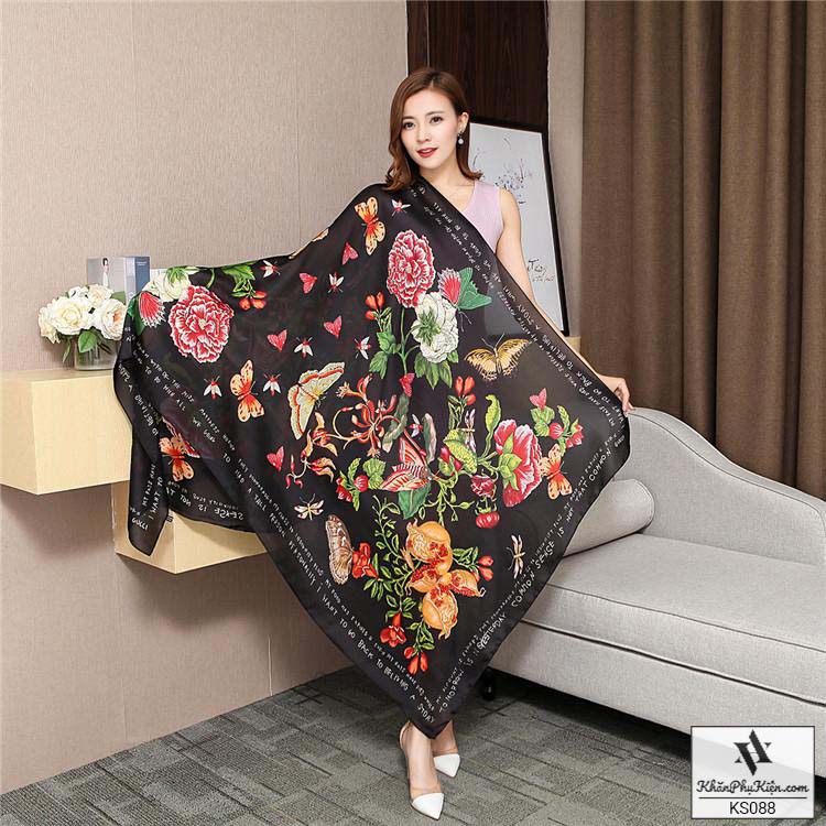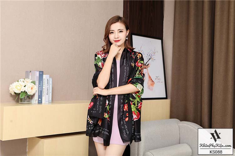 Khăn Choàng Cổ Lụa Họa Tiết Hoa Nền Màu Vàng Đen - Mã KS088