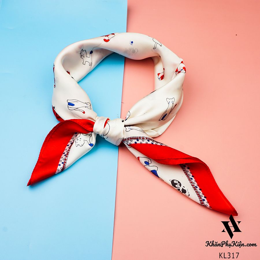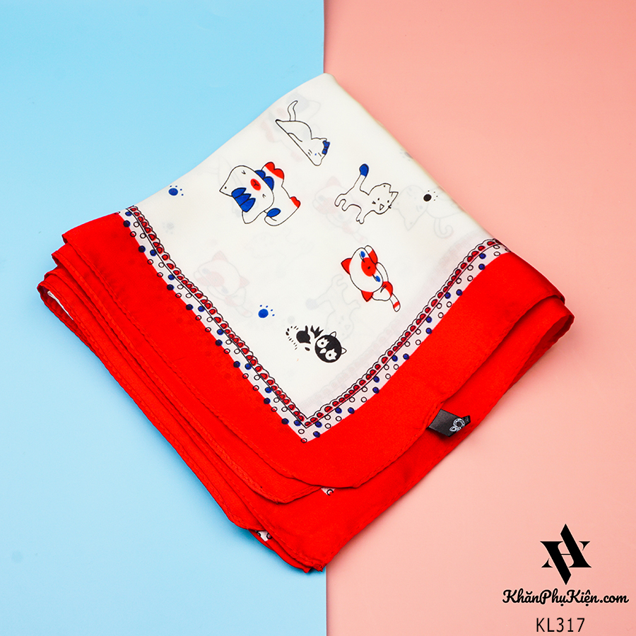 Khăn Lụa Vuông Họa Tiết Mèo Con Viền Đỏ Nền Trắng - Mã KL317