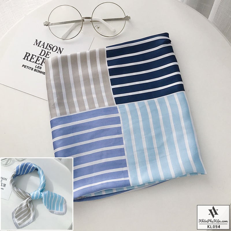 Khăn Lụa Vuông Họa Tiết Sọc Trắng Xanh Dương Viền Màu Xám - Mã KL094