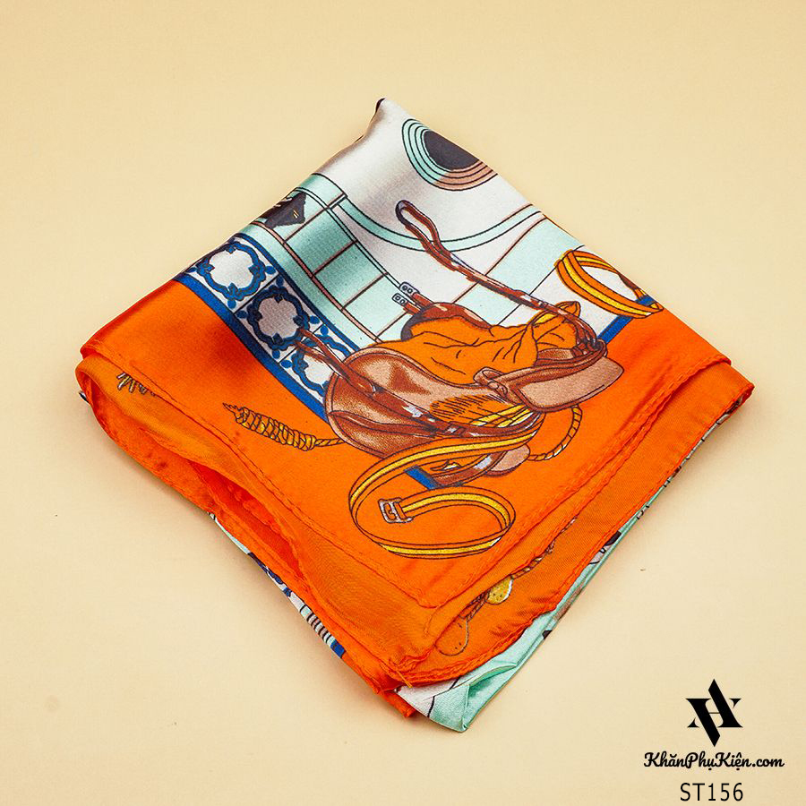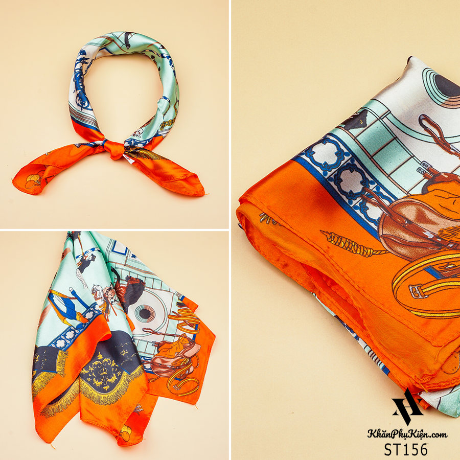 Khăn Satin Vuông Họa Tiết Horse Viền Cam Nền Xanh Ngọc - Mã ST156
