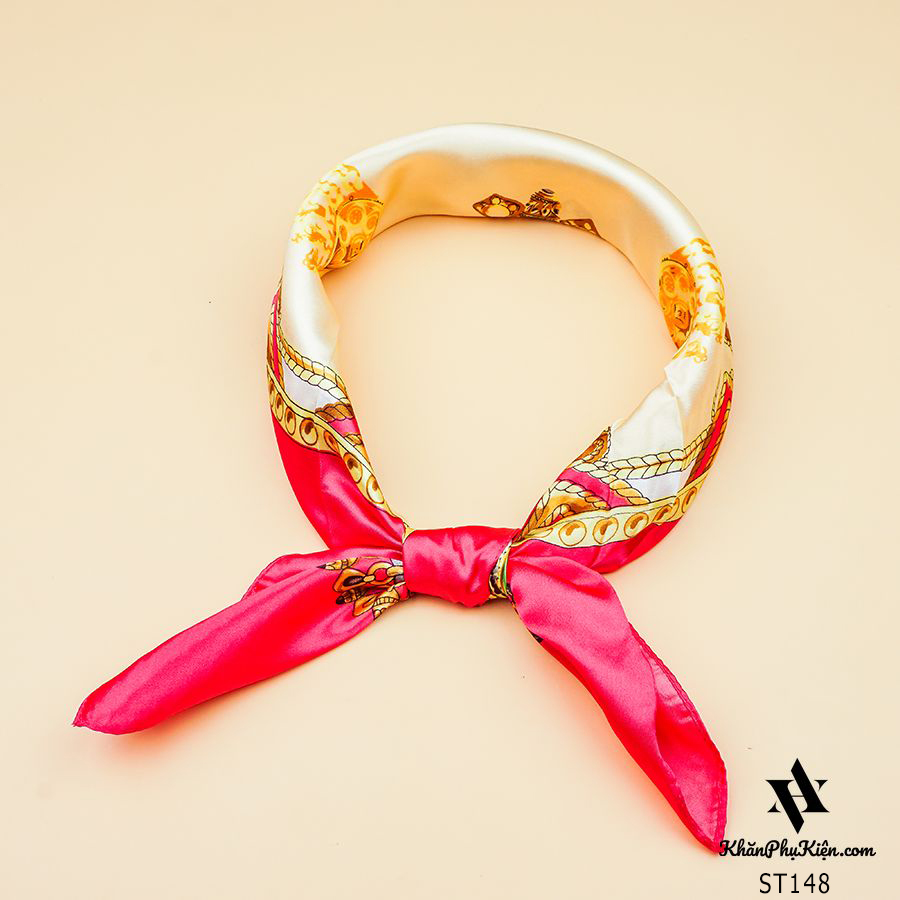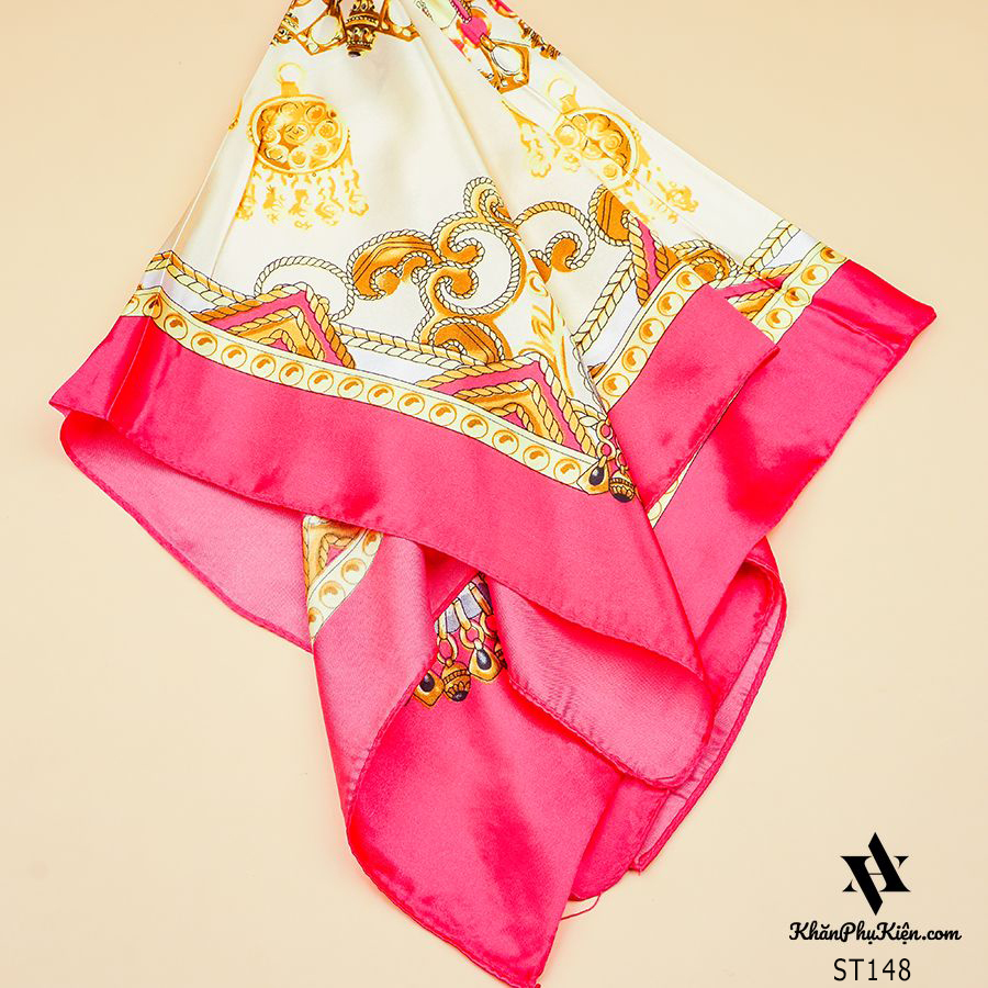 Khăn Satin Vuông Viền Hồng Họa Tiết Vàng Nền Trắng - Mã ST148