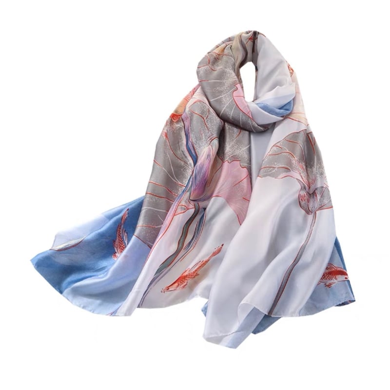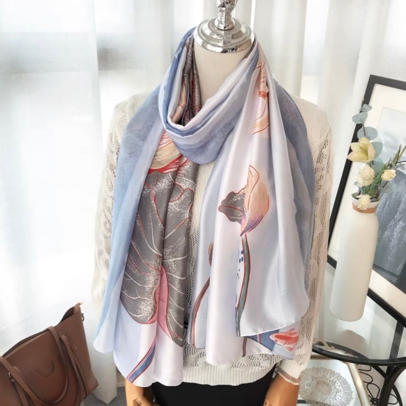 Quà tặng 20/10 cho sếp nữ, vợ, cô giáo, giáo viên nữ, mẹ và bạn gái, người yêu nữ quà tặng khăn choàng cổ lụa trắng phối xanh nhạt họa tiết hoa lá cỏ LAGU Khăn Phụ Kiện