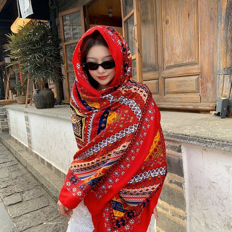 Quà tặng 20/10 cho sếp nữ, vợ, cô giáo, giáo viên nữ, mẹ và bạn gái, người yêu nữ quà tặng khăn quàng choàng cổ nữ đi biển boho thổ cẩm đẹp cao cấp màu đỏ họa tiết - Mã KC421