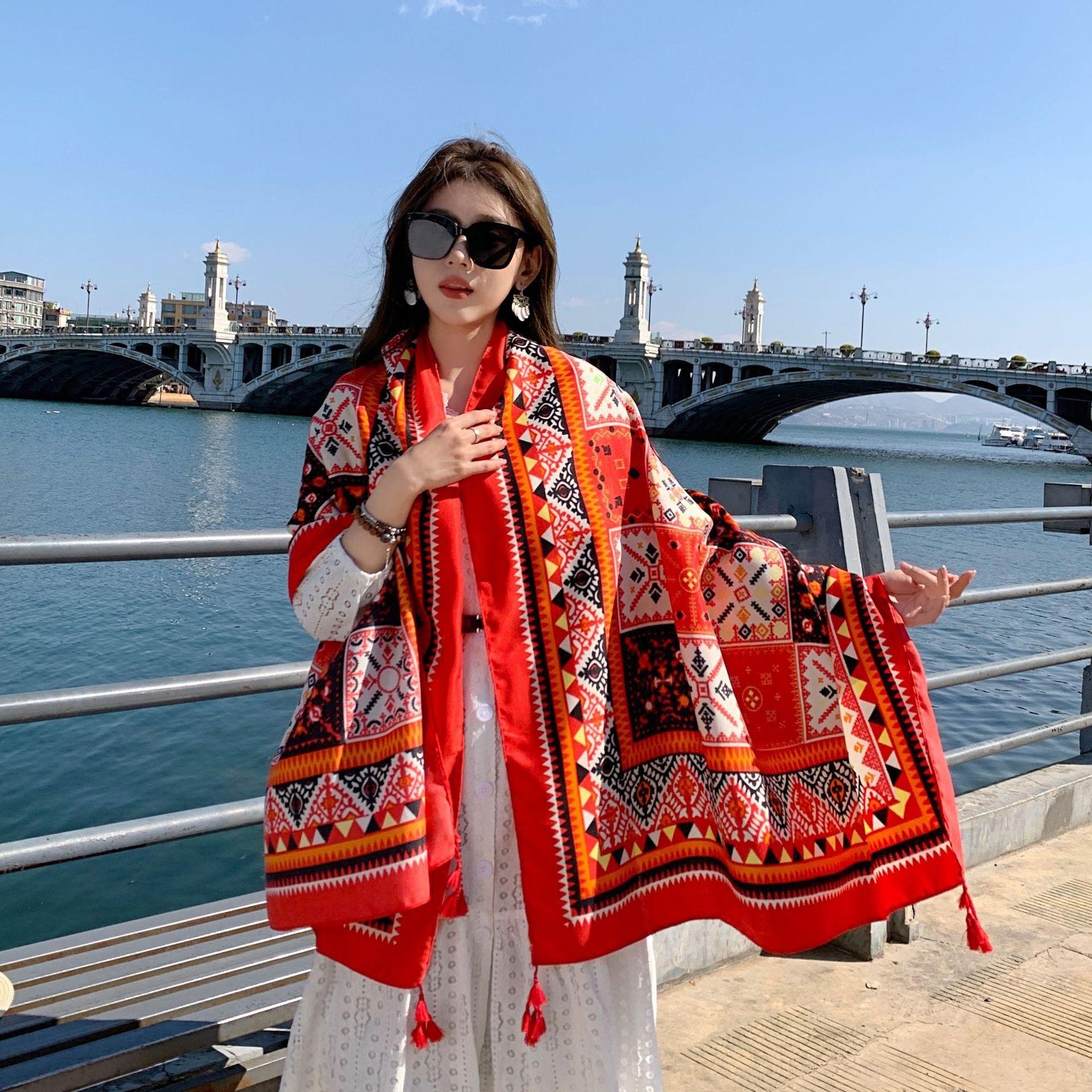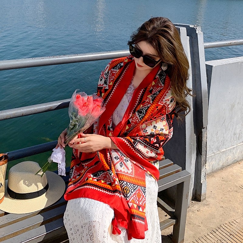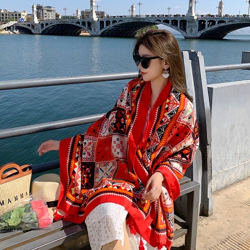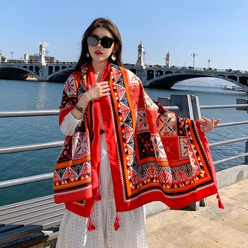 Quà tặng 20/10 cho sếp nữ, vợ, cô giáo, giáo viên nữ, mẹ và bạn gái, người yêu nữ quà tặng khăn quàng choàng cổ nữ đi biển boho thổ cẩm đẹp cao cấp màu đỏ nâu - Mã KC307