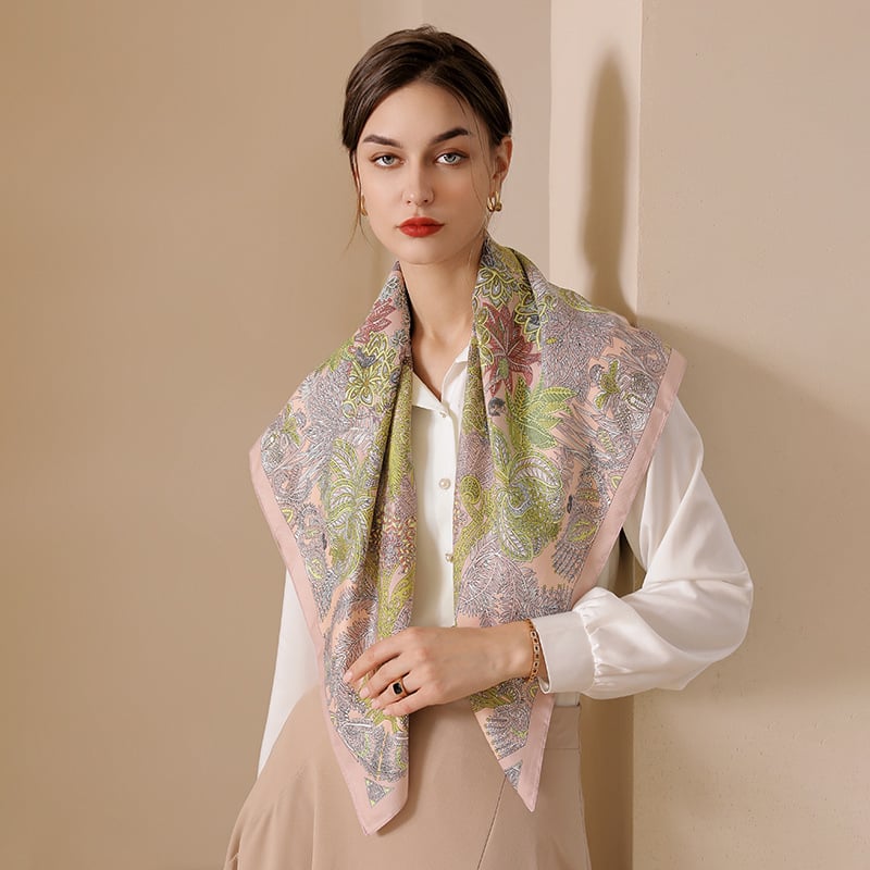 Quà tặng 20/10 cho sếp nữ, vợ, cô giáo, giáo viên nữ, mẹ và bạn gái, người yêu nữ quà tặng khăn quàng choàng cổ lụa vuông cao cấp cho nữ văn phòng sở đẹp họa tiết cây cỏ màu hồng pastel LAGU Khăn Phụ Kiện- K9045