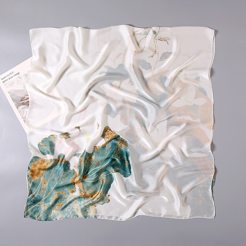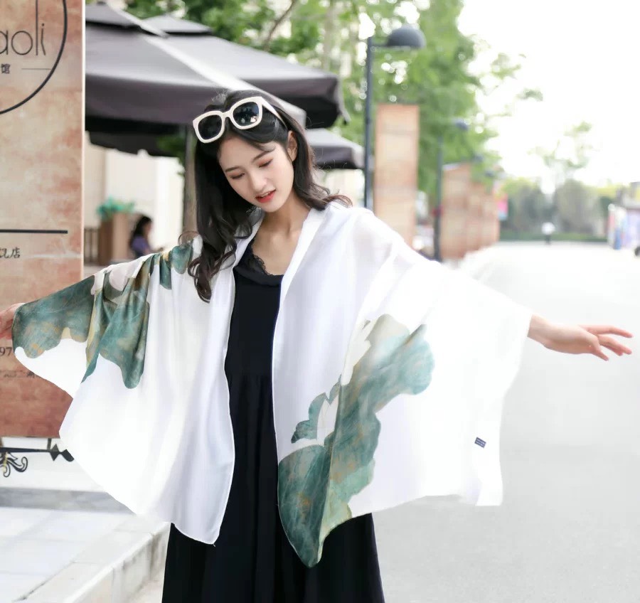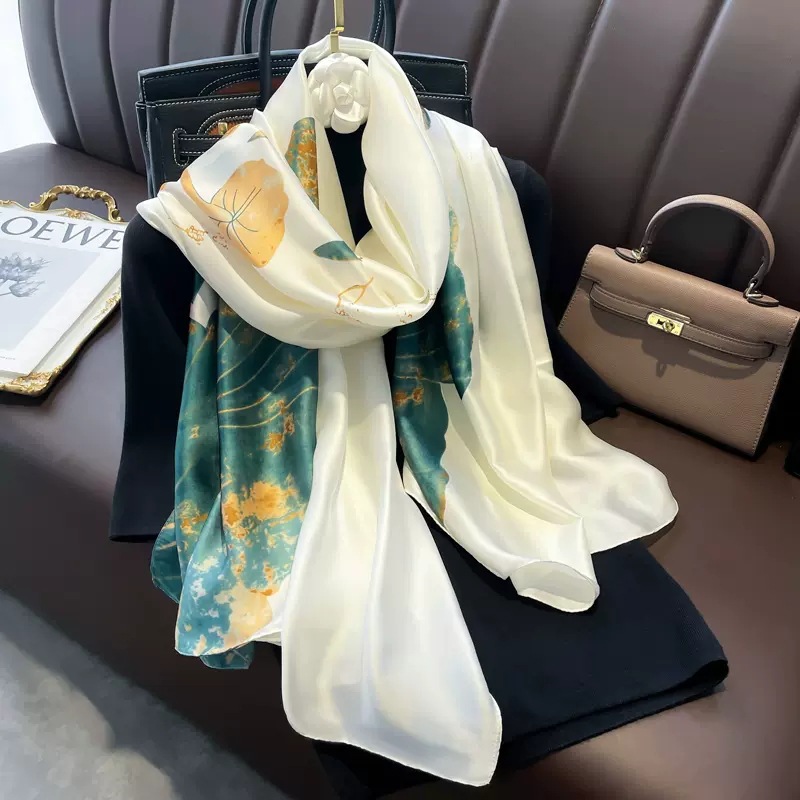 Mô tả Khăn quàng choàng cổ lụa cao cấp cho nữ văn phòng sở đẹp lụa hoa sen trắng xanh