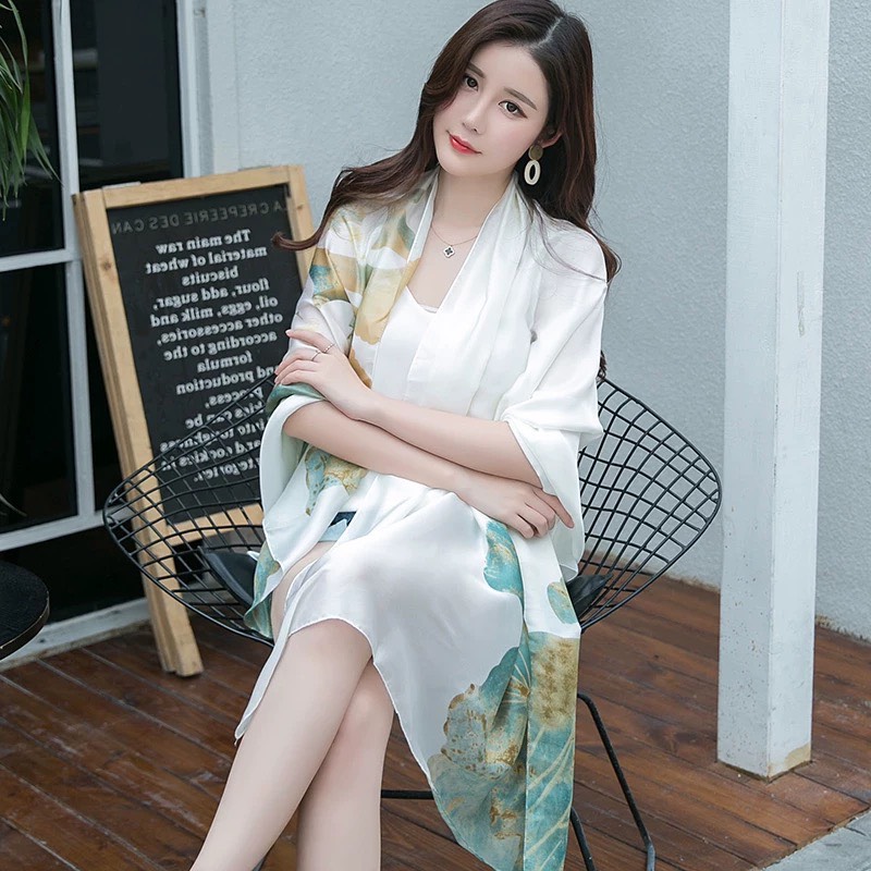 Quà tặng 20/11 cho cô giáo, giáo viên quà set khăn quàng choàng cổ lụa cao cấp cho nữ văn phòng sở đẹp lụa hoa sen trắng xanh - Mã KS021