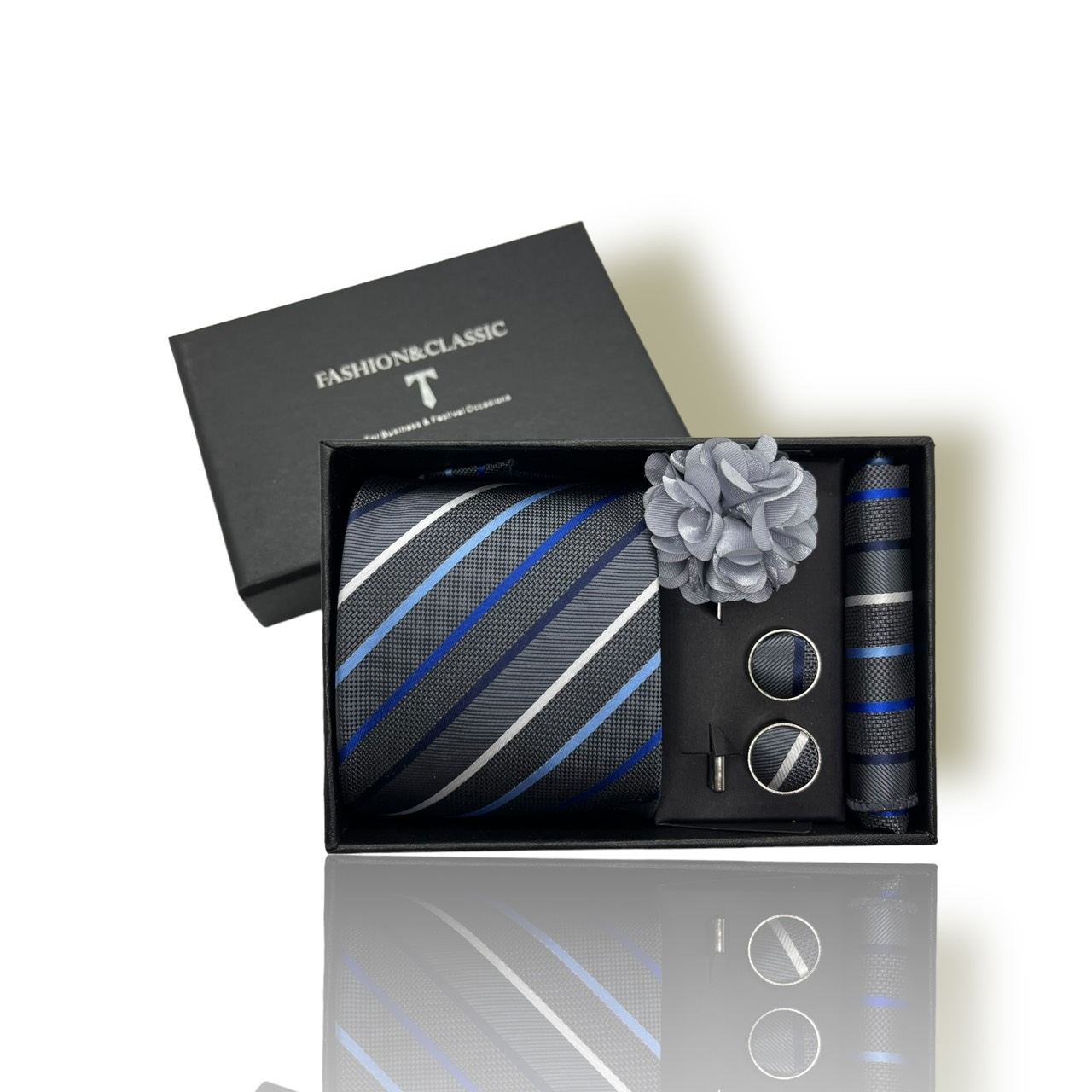 Với nhiều mẫu mã và màu sắc khác nhau, set cà vạt 4 món phù hợp với nhiều phong cách và sự kiện khác nhau. Cho dù bạn đang chuẩn bị cho một buổi tiệc trang trí, một cuộc họp quan trọng, hay chỉ là một ngày thường, set này đều là sự lựa chọn linh hoạt và đa dạng. Bộ sản phẩm gồm: