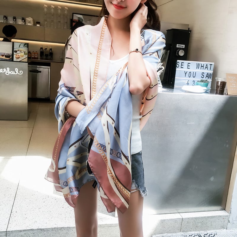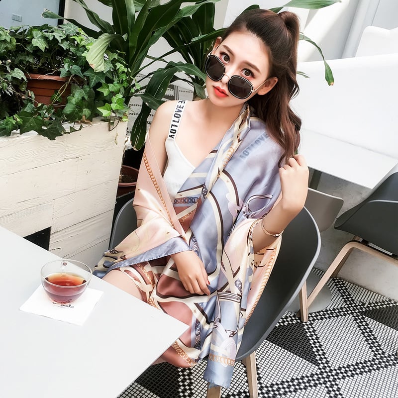 Quà tặng 8/3 cho người yêu nữ, vợ, cô giáo, mẹ - Khăn Choàng Cổ Lụa Họa Tiết Dây Xích Phối Nhiều Màu Nền Xanh - Lụa Silk - 180x90cm - Mã KS166