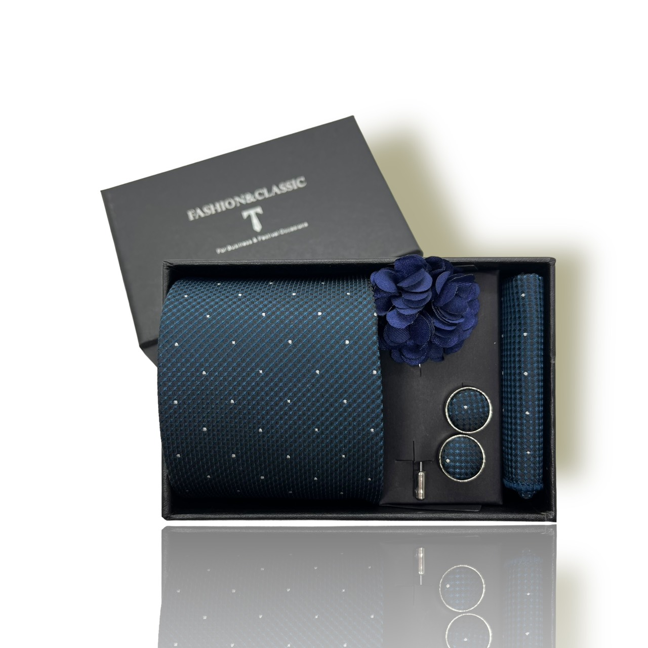 Với nhiều mẫu mã và màu sắc khác nhau, set cà vạt 4 món phù hợp với nhiều phong cách và sự kiện khác nhau. Cho dù bạn đang chuẩn bị cho một buổi tiệc trang trí, một cuộc họp quan trọng, hay chỉ là một ngày thường, set này đều là sự lựa chọn linh hoạt và đa dạng. Bộ sản phẩm gồm:
