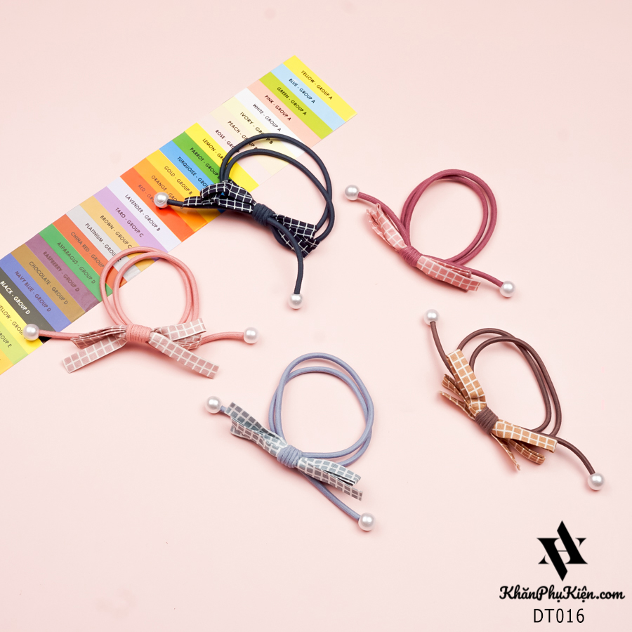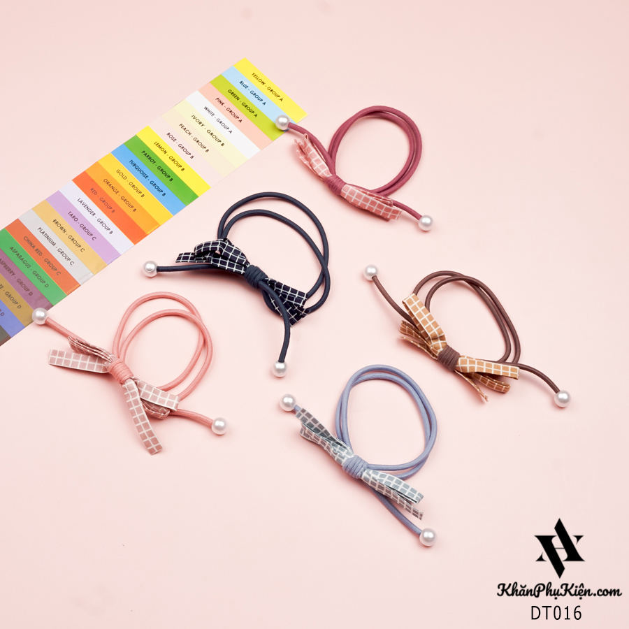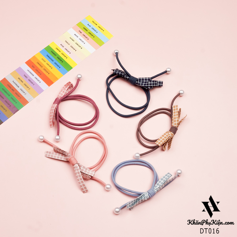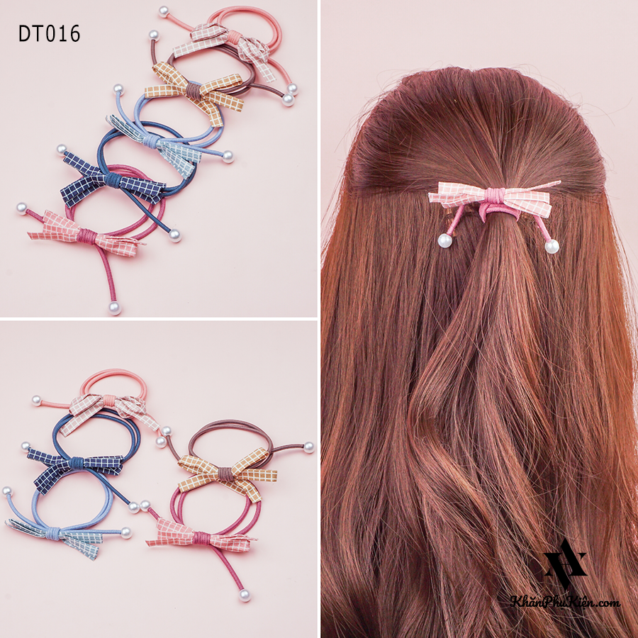 Set Cột Tóc 5 Màu Nơ Kẻ Ô Trắng Phối Hạt Ngọc - Mã DT016