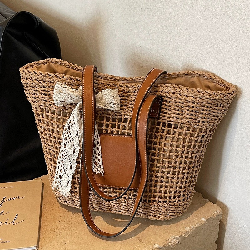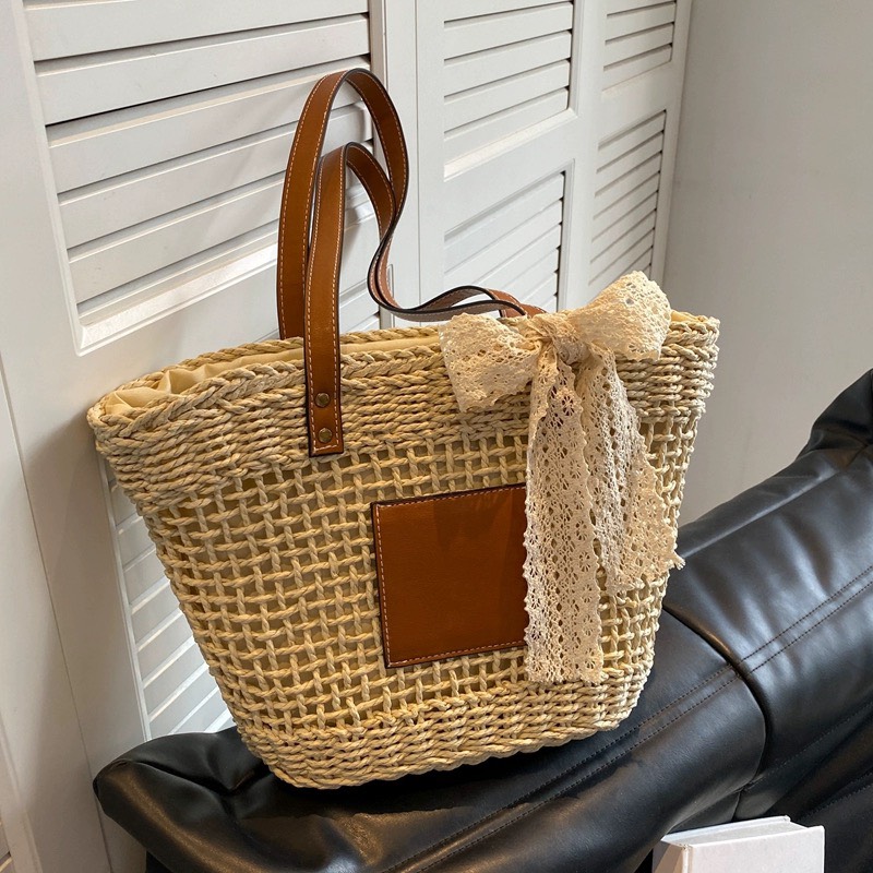 Mô tả Túi cói đi biển vintage thời trang nữ phong cách cầm tay Hàn Quốc đẹp cổ điển màu nâu phối nơ